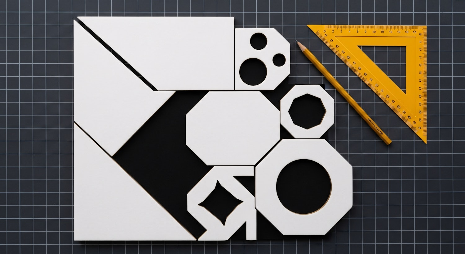 Geometric shapes and tools on a grid background, featuring white cut-outs, a yellow ruler, and pencil for a clean, modern design aesthetic.