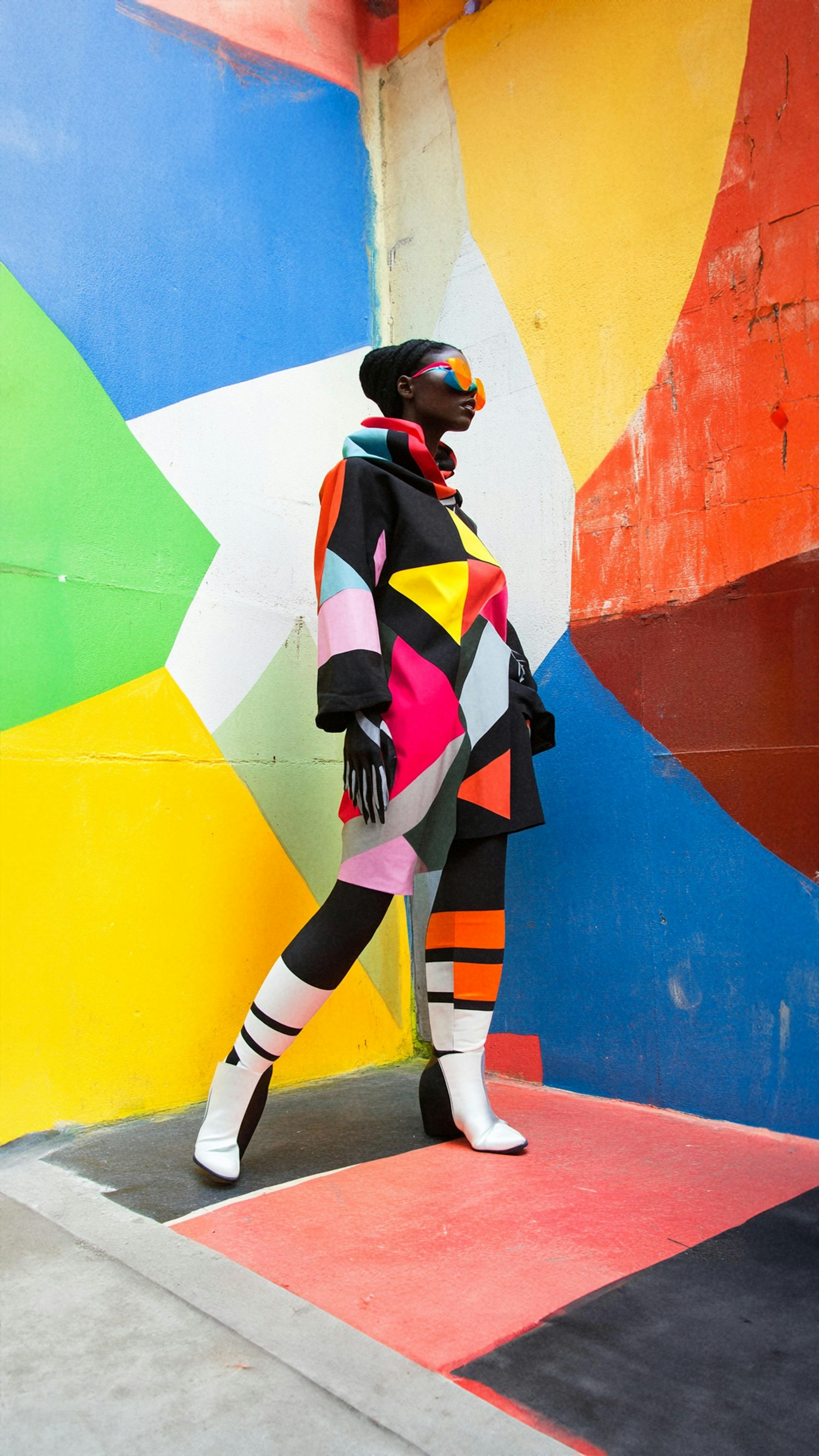 Bold fashion meets vibrant art! A woman in a colorful geometric outfit poses against a matching mural, blending style and creativity.