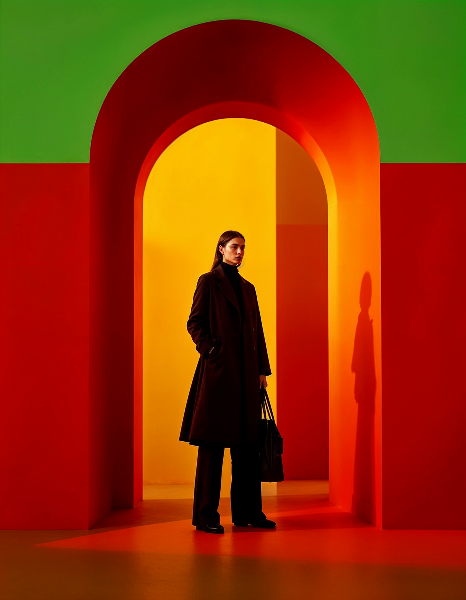 A woman in a black coat stands in a bold, colorful archway with red, yellow, and green hues, creating a striking geometric composition.