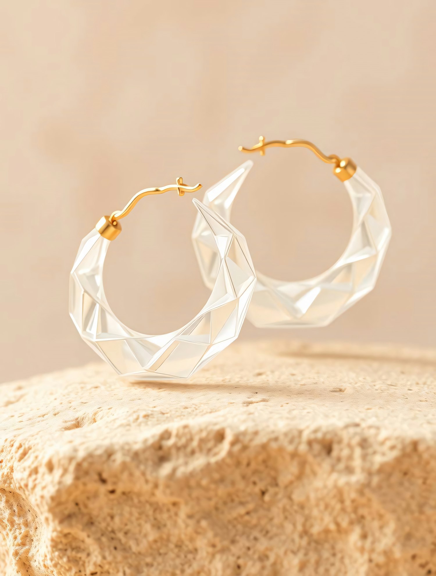Elegant geometric hoop earrings with gold clasps on a textured stone surface, set against a soft beige background.