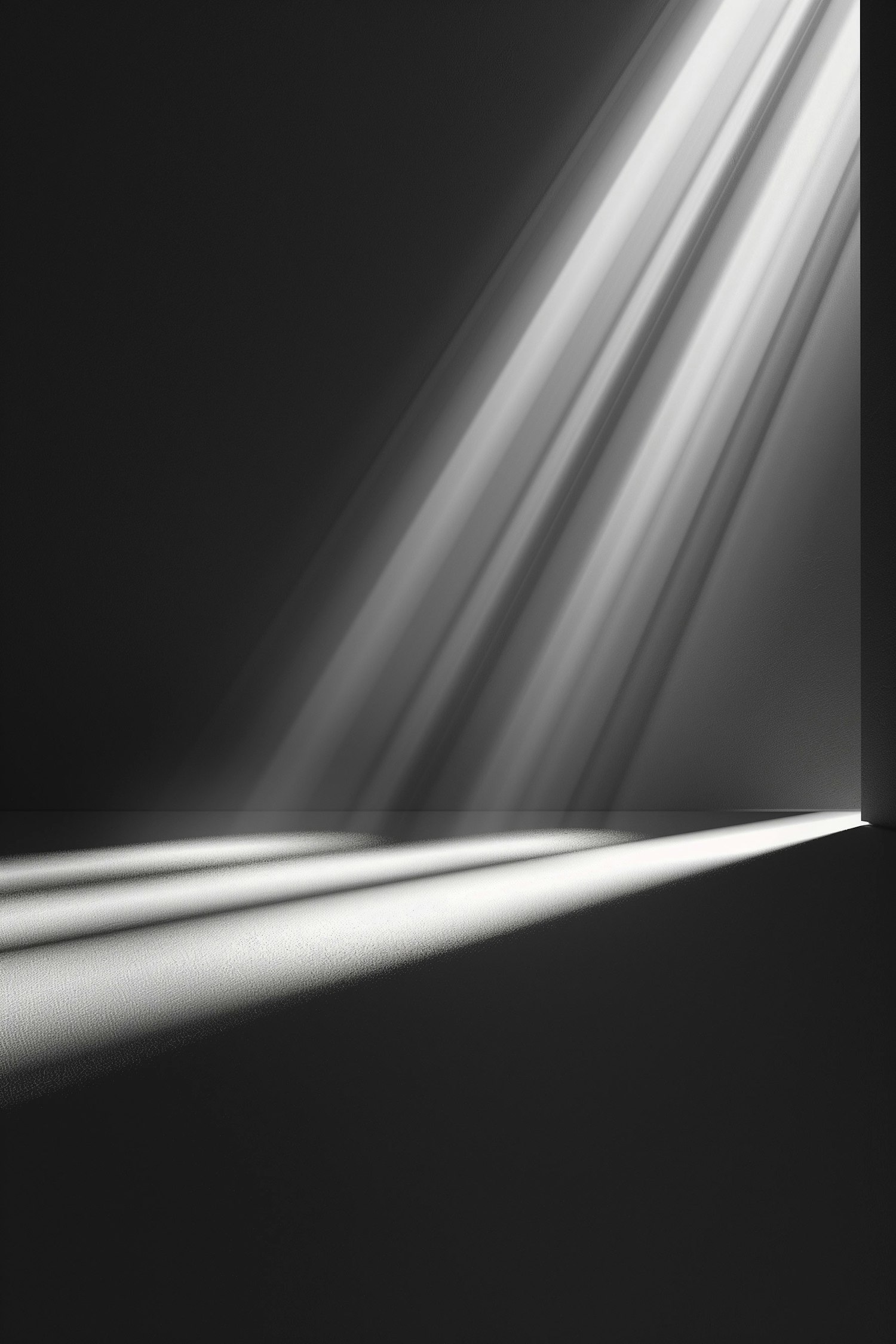 Minimalist dark room with beams of light casting shadows, creating a serene and contemplative atmosphere.