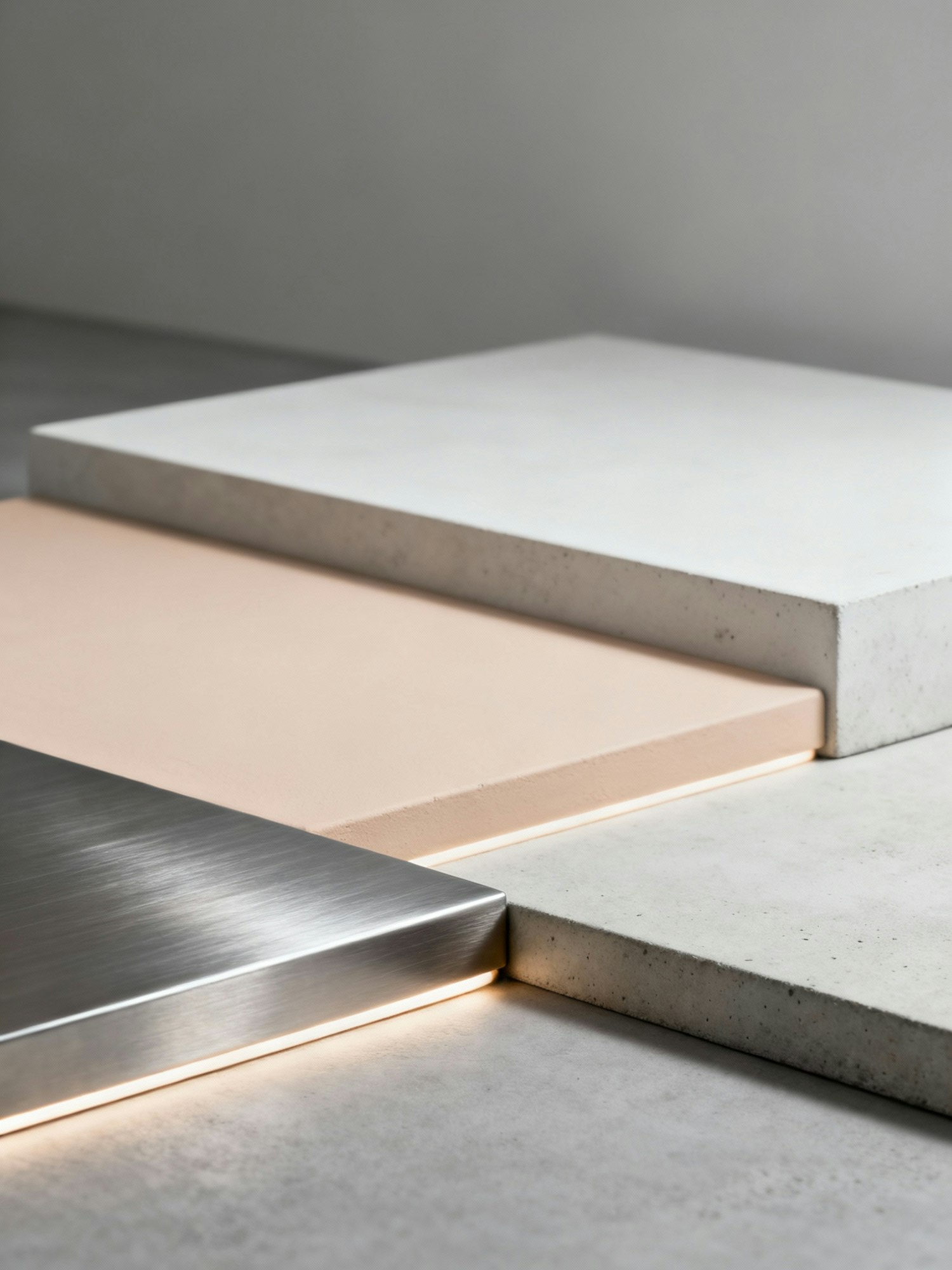 Minimalist arrangement of metal, concrete, and beige slabs with soft lighting highlighting textures and geometric alignment.