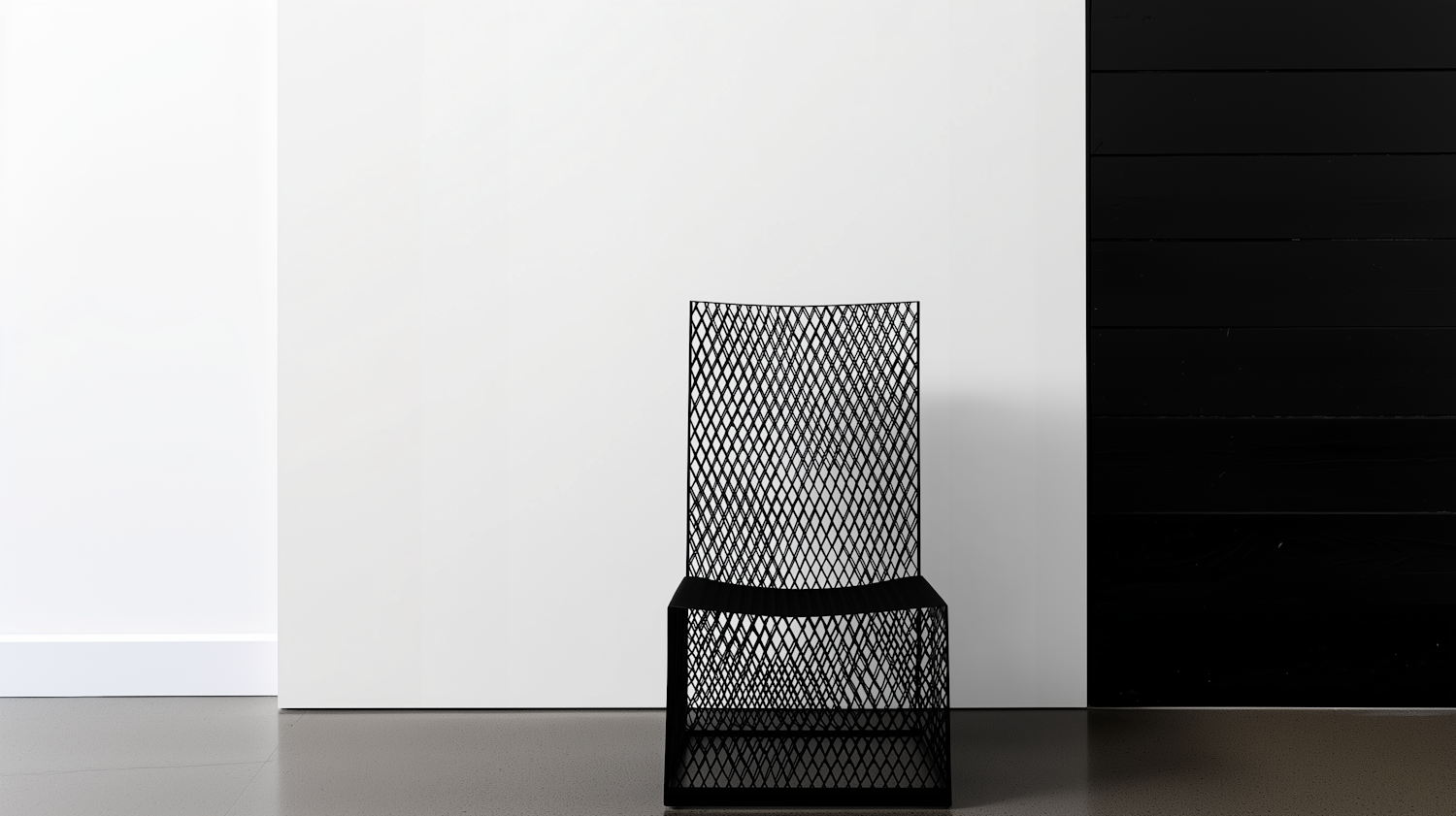 A sleek black lattice chair against a minimalist black-and-white wall, showcasing modern design and geometric elegance.