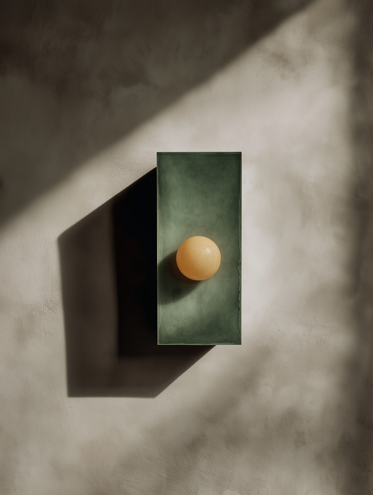 Minimalist design with a green block and orange sphere under dramatic lighting, emphasizing textures and geometric simplicity.