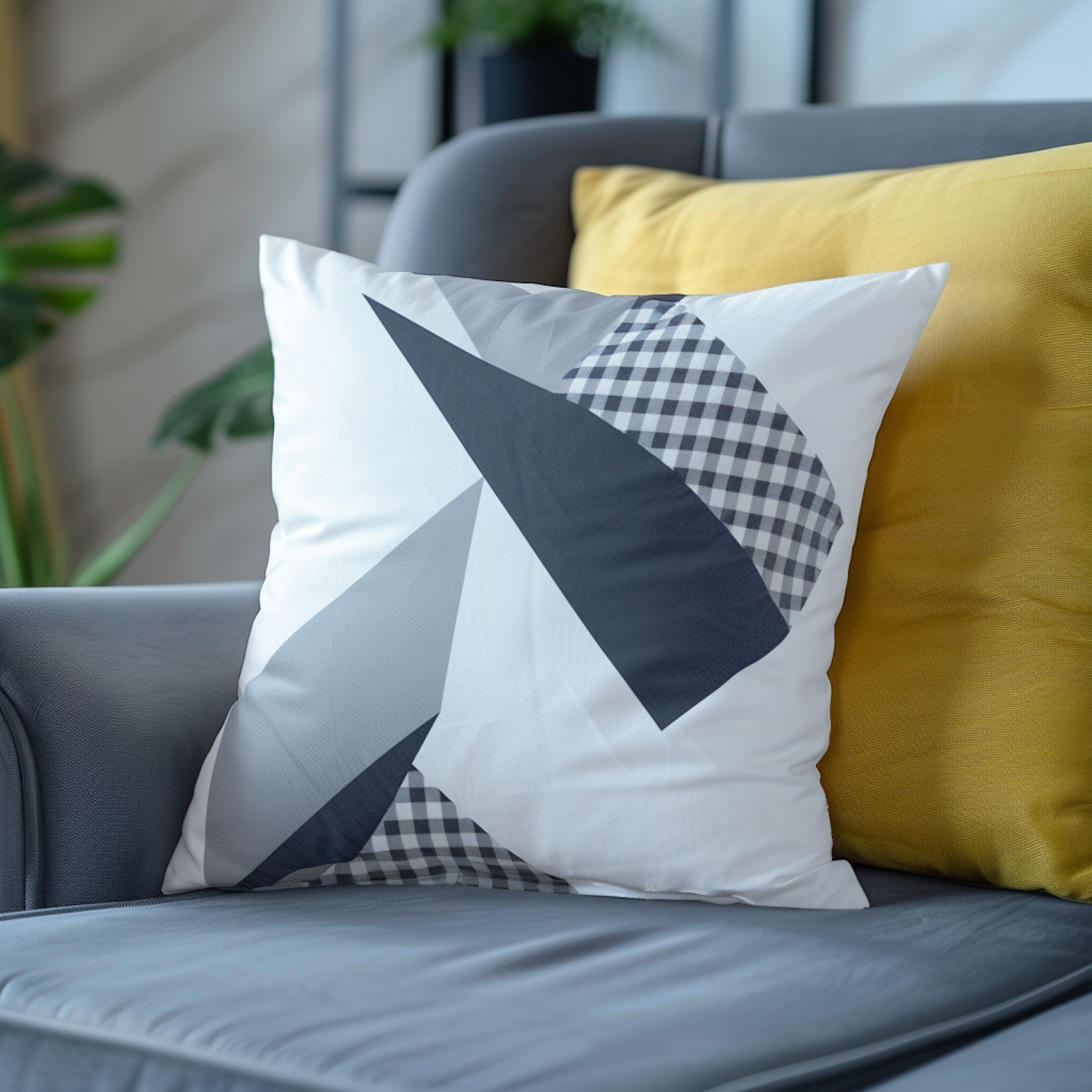 Modern geometric pillow on a gray sofa with a mustard yellow accent pillow, creating a stylish and cozy living space.