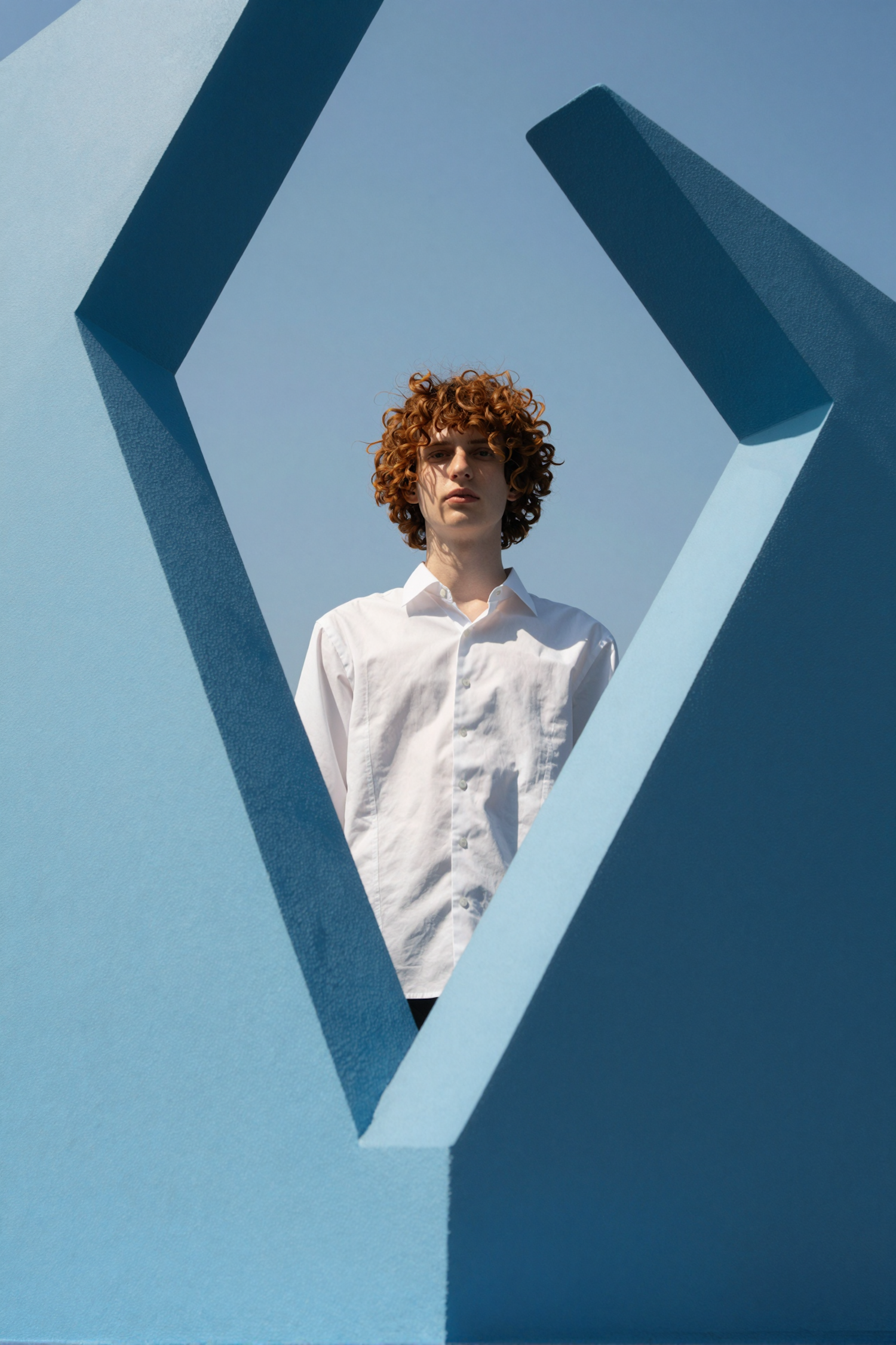 A person with curly red hair in a white shirt is framed by a blue geometric structure under a clear sky.