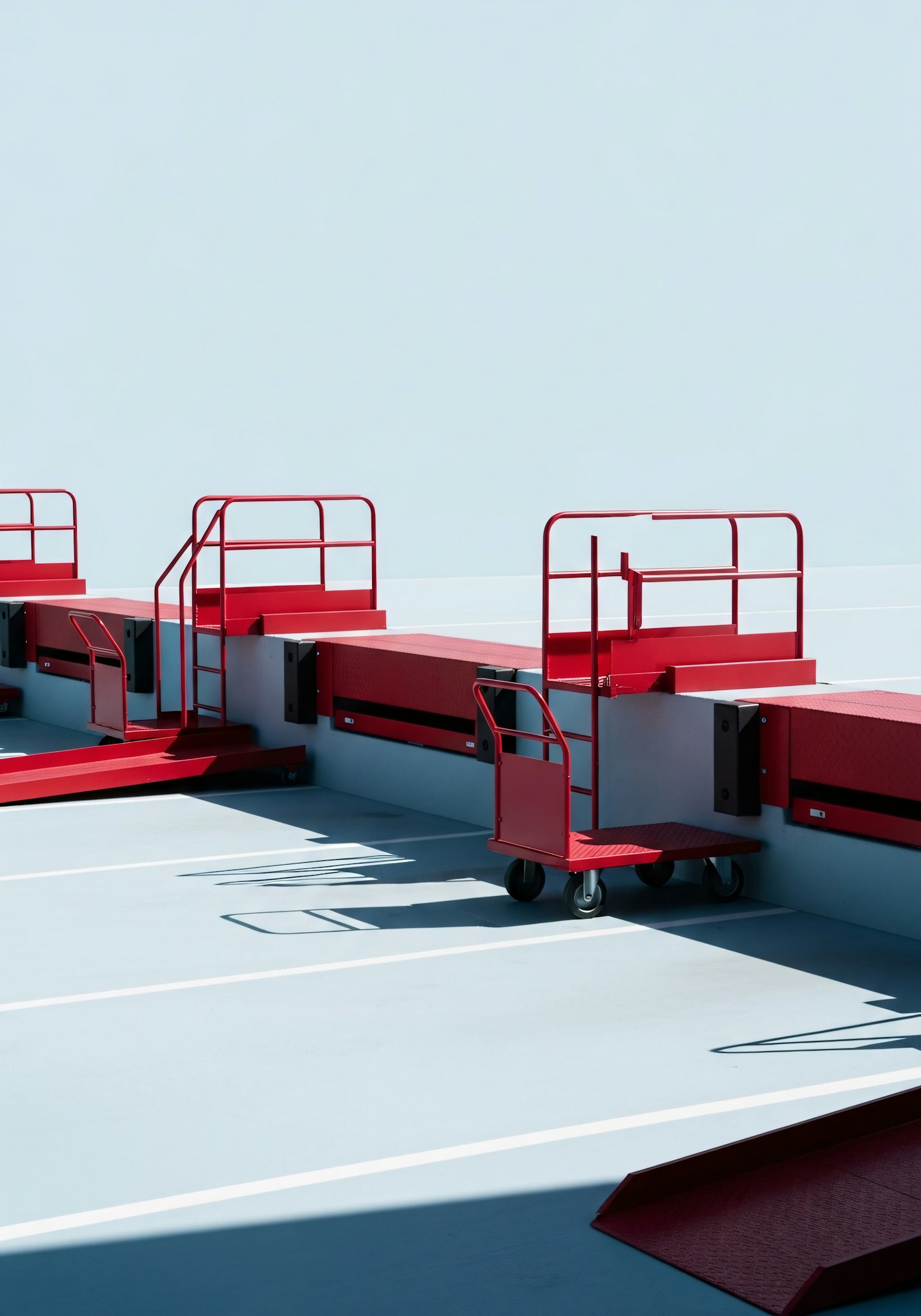 A minimalist industrial scene with vibrant red platforms and railings against a pale blue background, showcasing clean lines and geometric design.