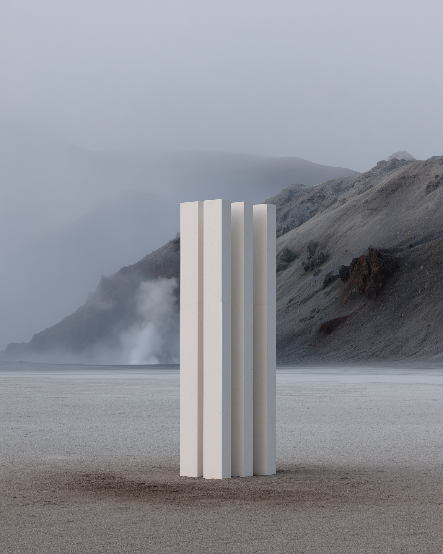 A white geometric sculpture stands in a barren, misty landscape with rugged mountains in the background, creating a minimalist aesthetic.