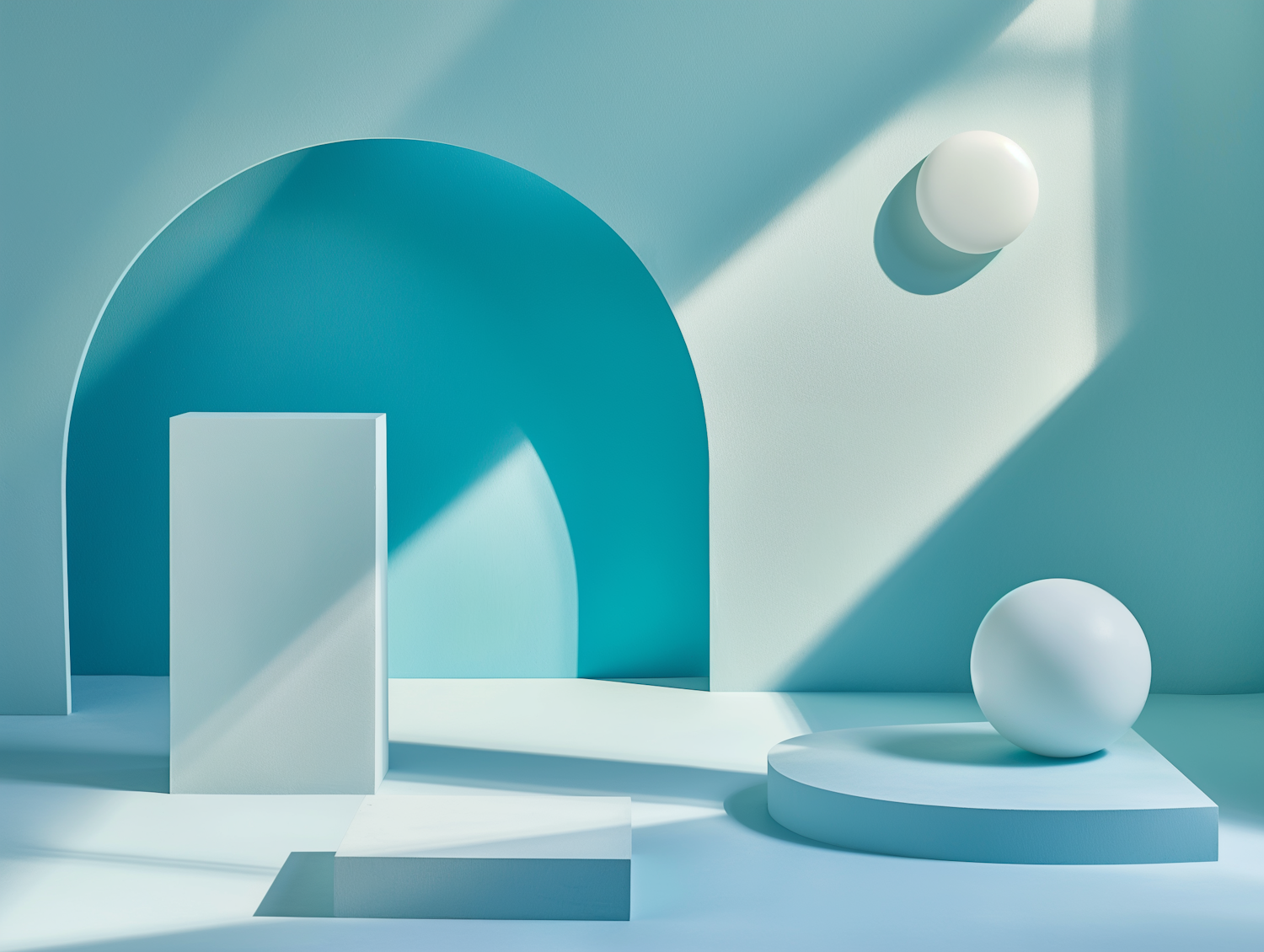 Minimalist geometric design with pastel blue tones, featuring spheres, pedestals, and an arched backdrop in soft sunlight.
