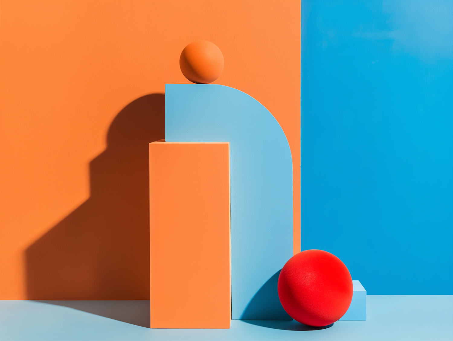Abstract geometric composition with orange and blue shapes, featuring spheres and blocks in a vibrant, colorful setting.