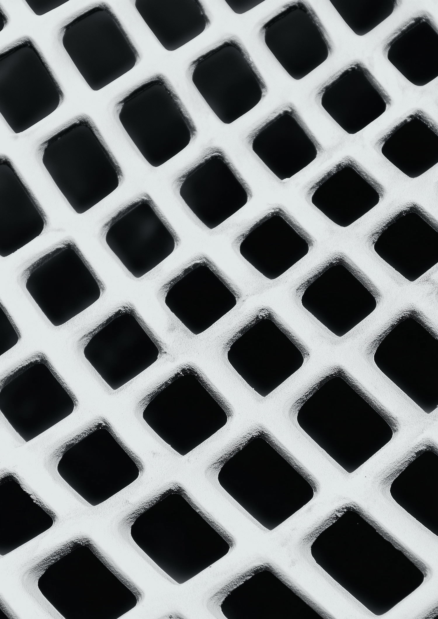 Close-up of a light-colored grid with square openings against a dark background, creating a striking geometric pattern.
