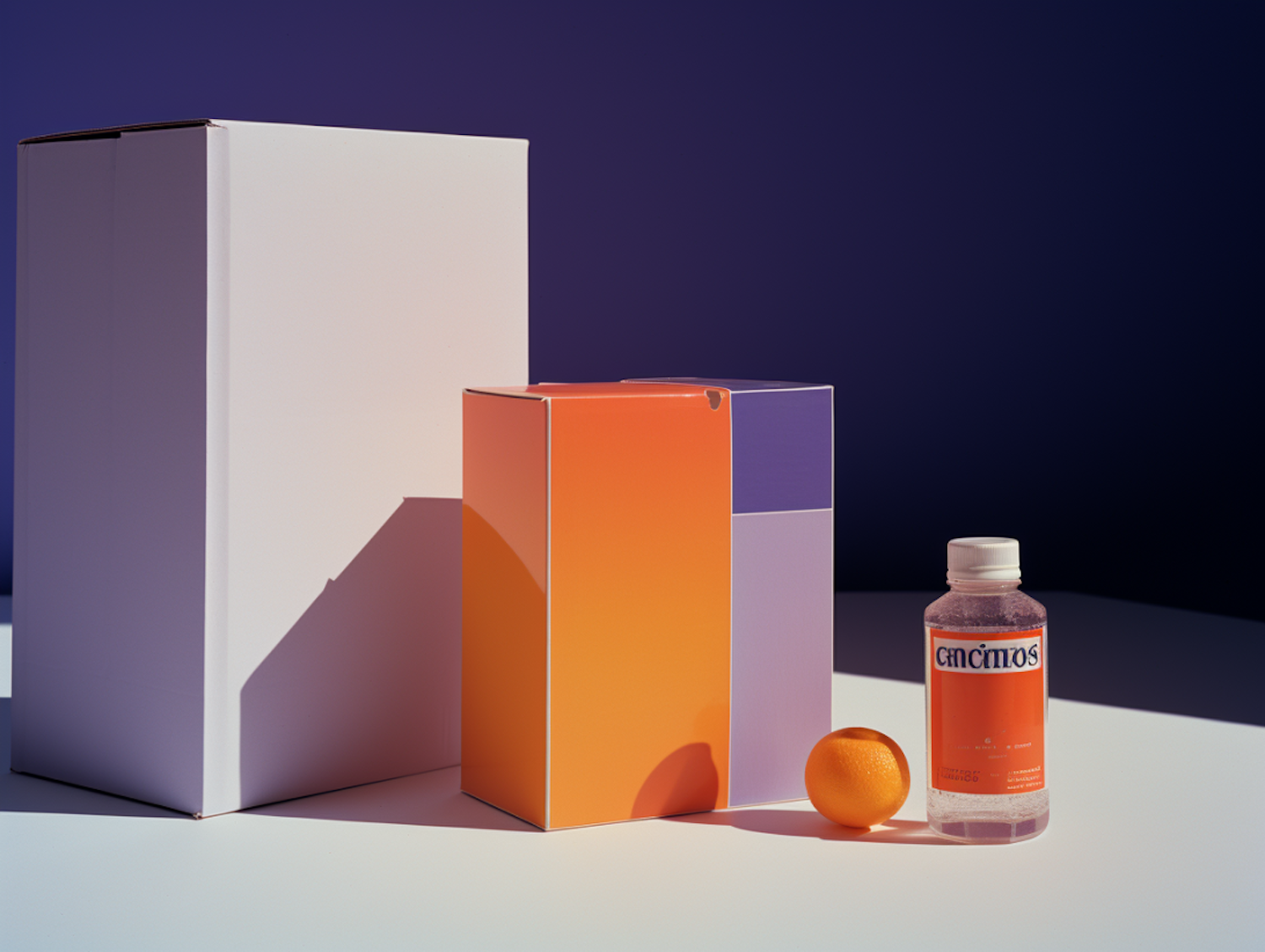 Minimalist setup with a white box, colorful orange-purple box, clear bottle labeled 'CINCINOS,' and an orange fruit on a blue backdrop.