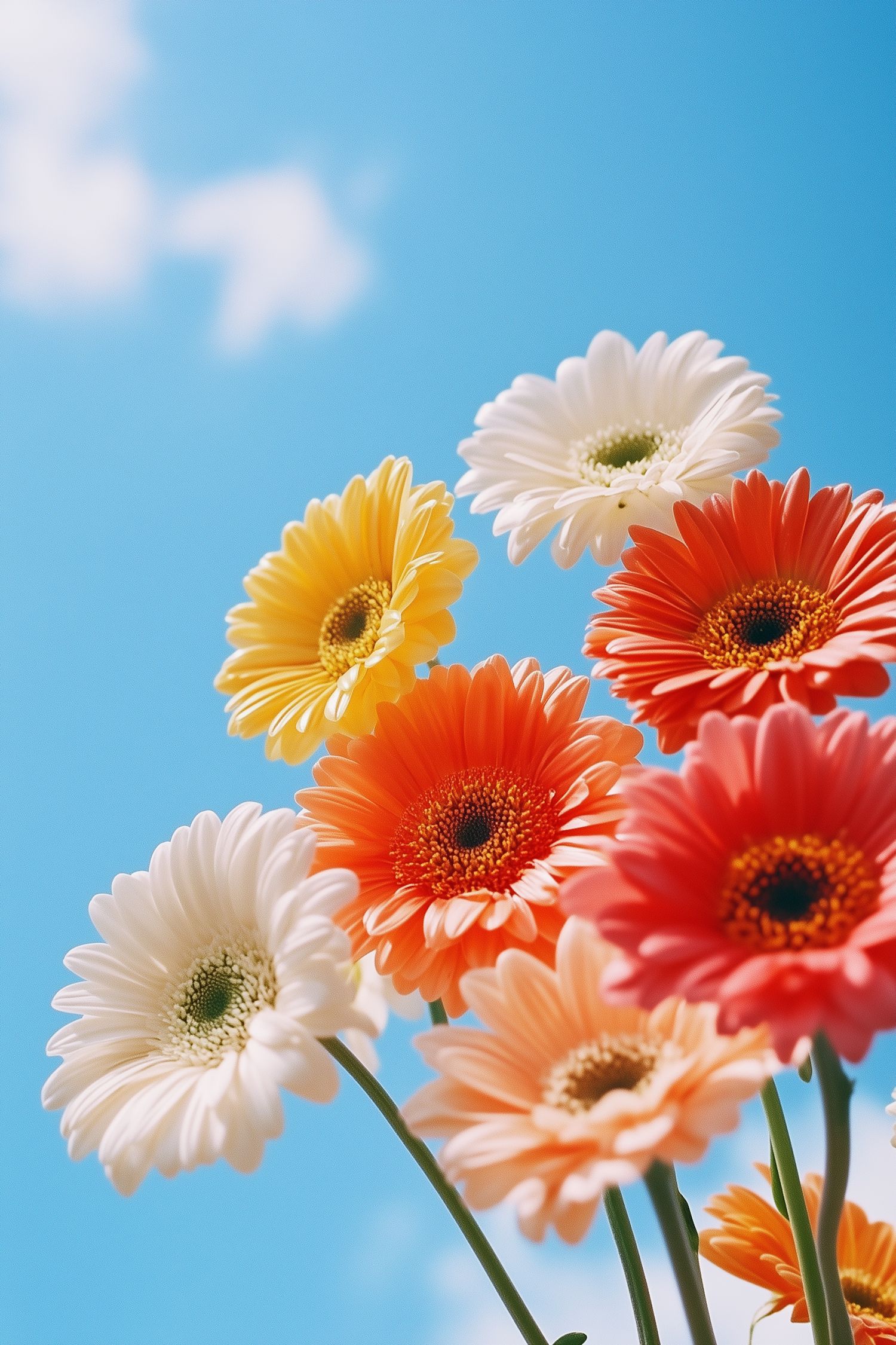 Bright gerbera daisies in white, yellow, orange, and peach bloom against a vivid blue sky, creating a cheerful and sunny scene.