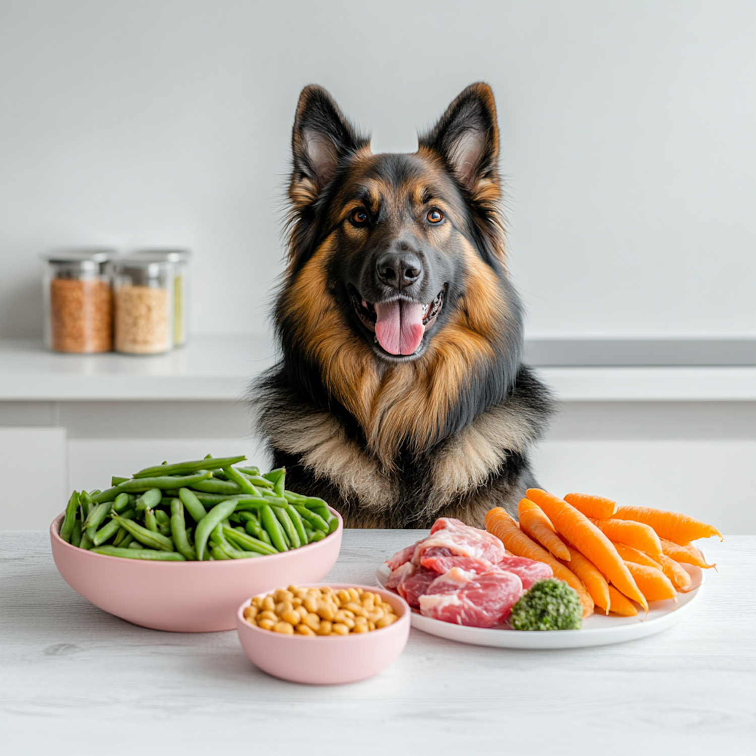 German Shepherd with a happy expression sits behind a table with bowls of green beans, chickpeas, raw meat, carrots, and broccoli.