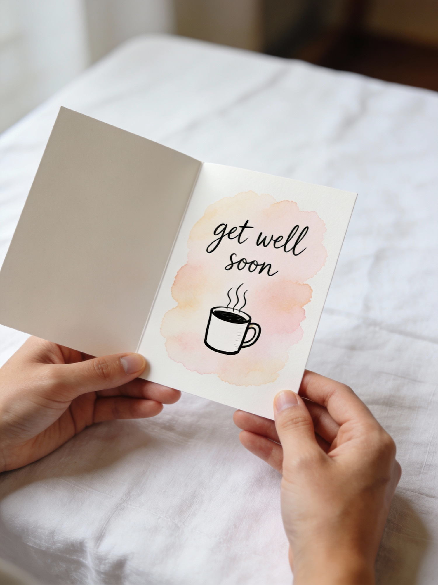 A person holds a 'get well soon' card with a pastel watercolor design and a steaming cup illustration, conveying warmth and care.