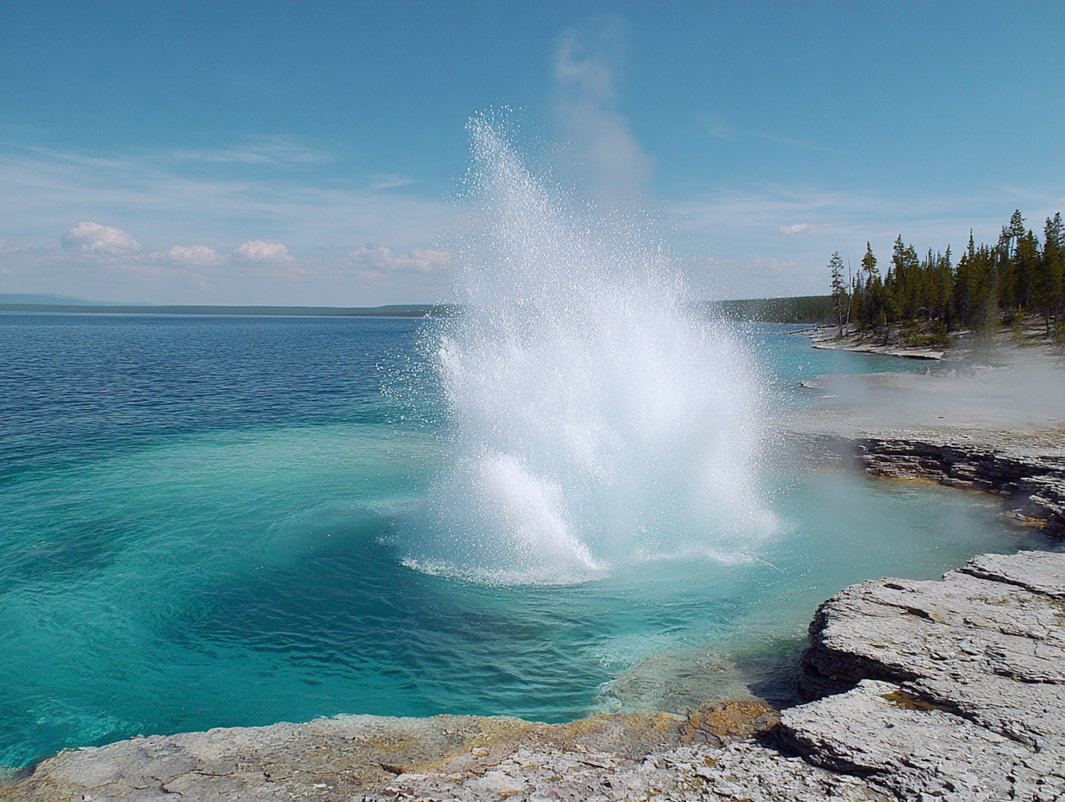 A stunning lakeside setting with a geyser erupting, surrounded by vibrant blue waters, rocky edges, and a serene forested backdrop.