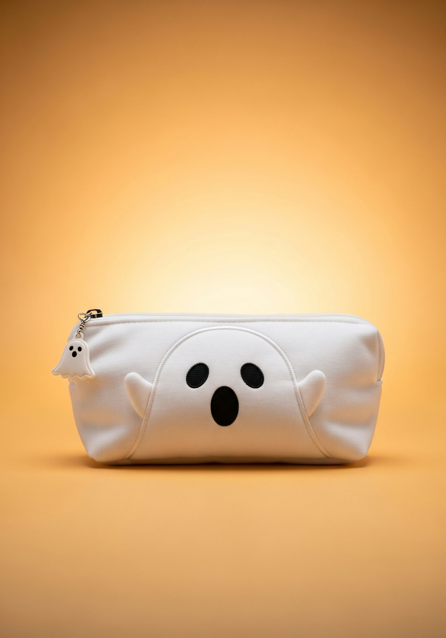 A white ghost-themed pouch with a cute charm, set against a warm orange background, perfect for Halloween or fun storage.