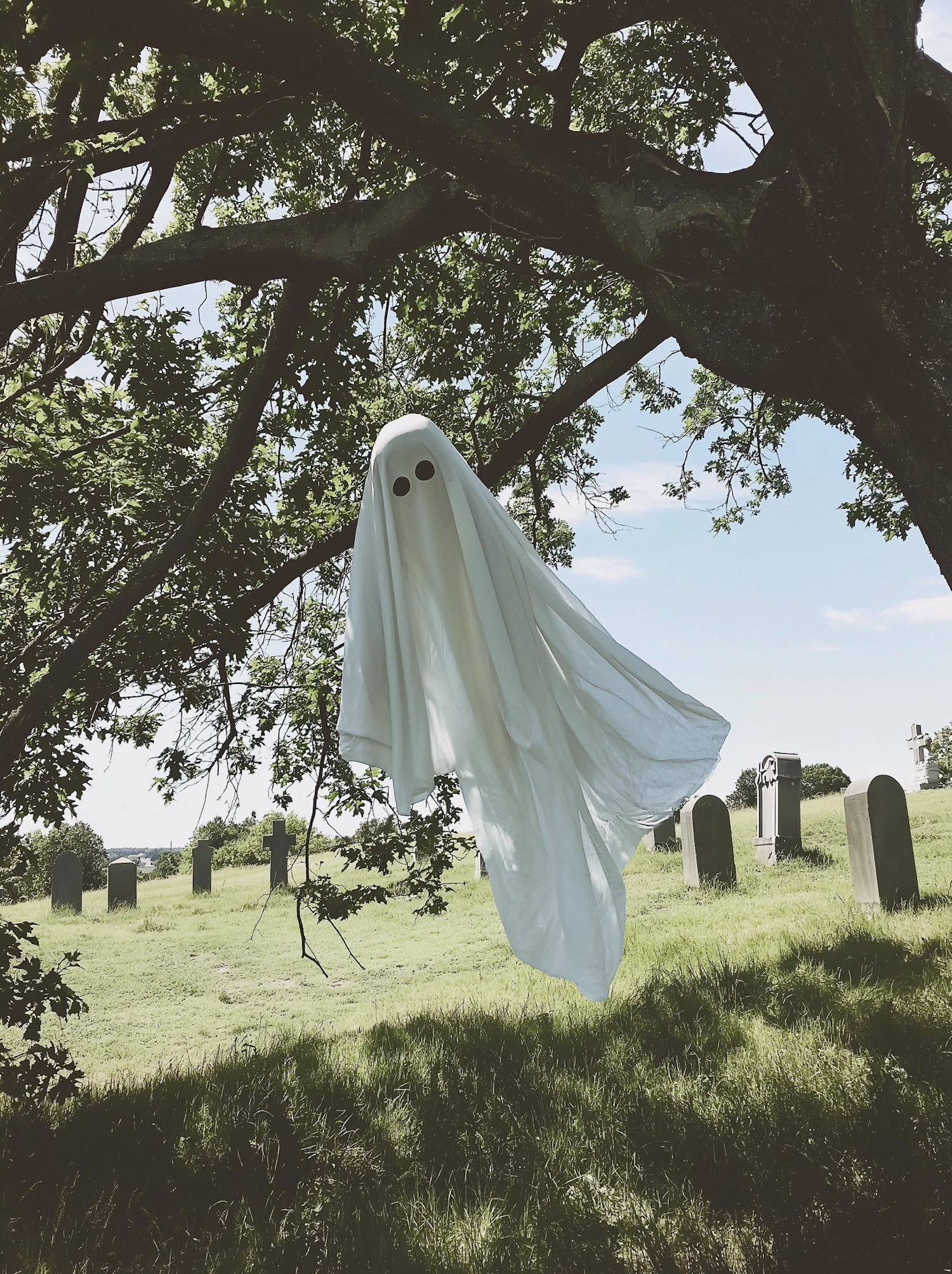 Playful ghost in a white sheet hangs from a tree in a sunny graveyard, surrounded by tombstones and lush greenery.