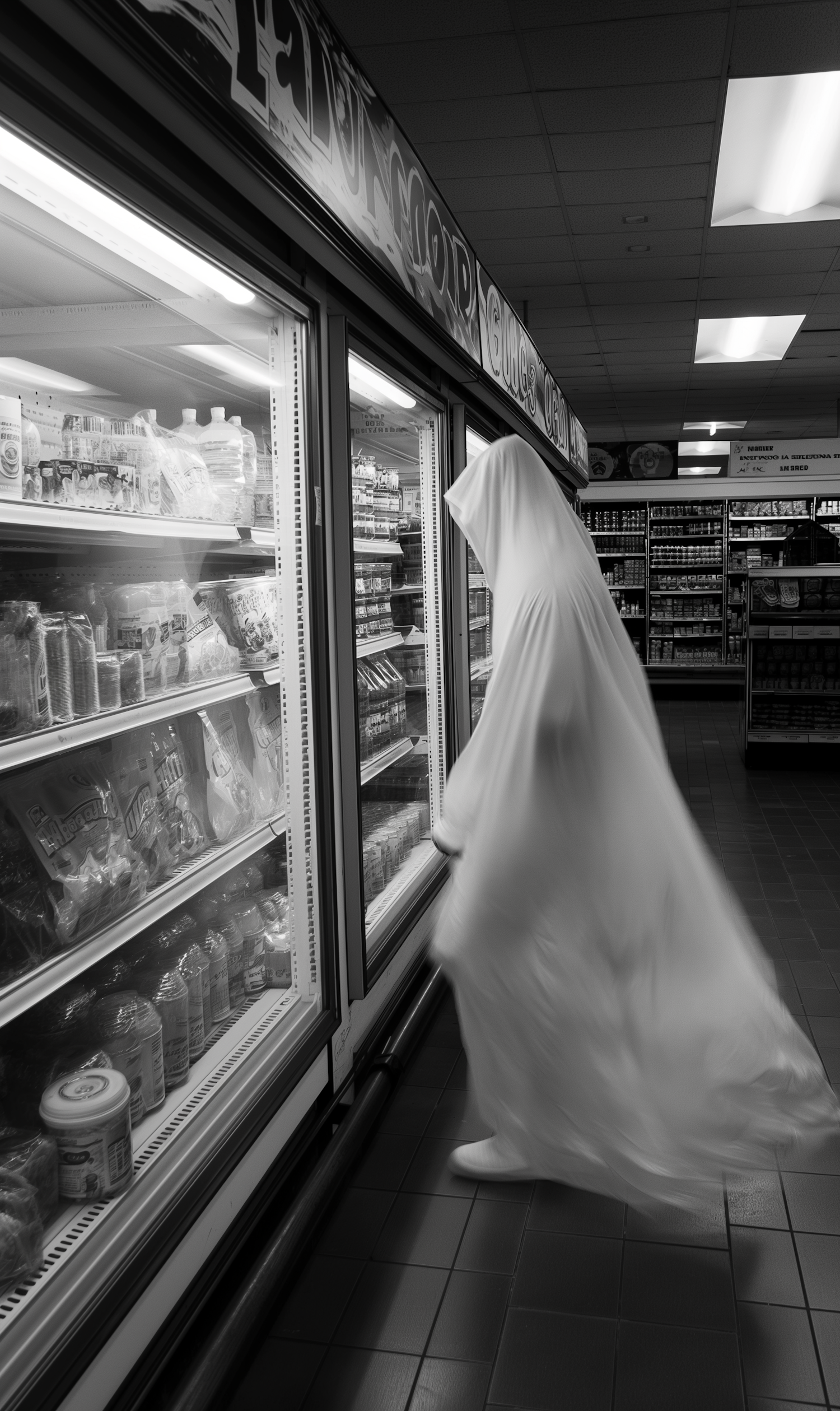 A ghostly figure in a grocery store, dressed in a white sheet, stands by the refrigerated section. Black and white photo.
