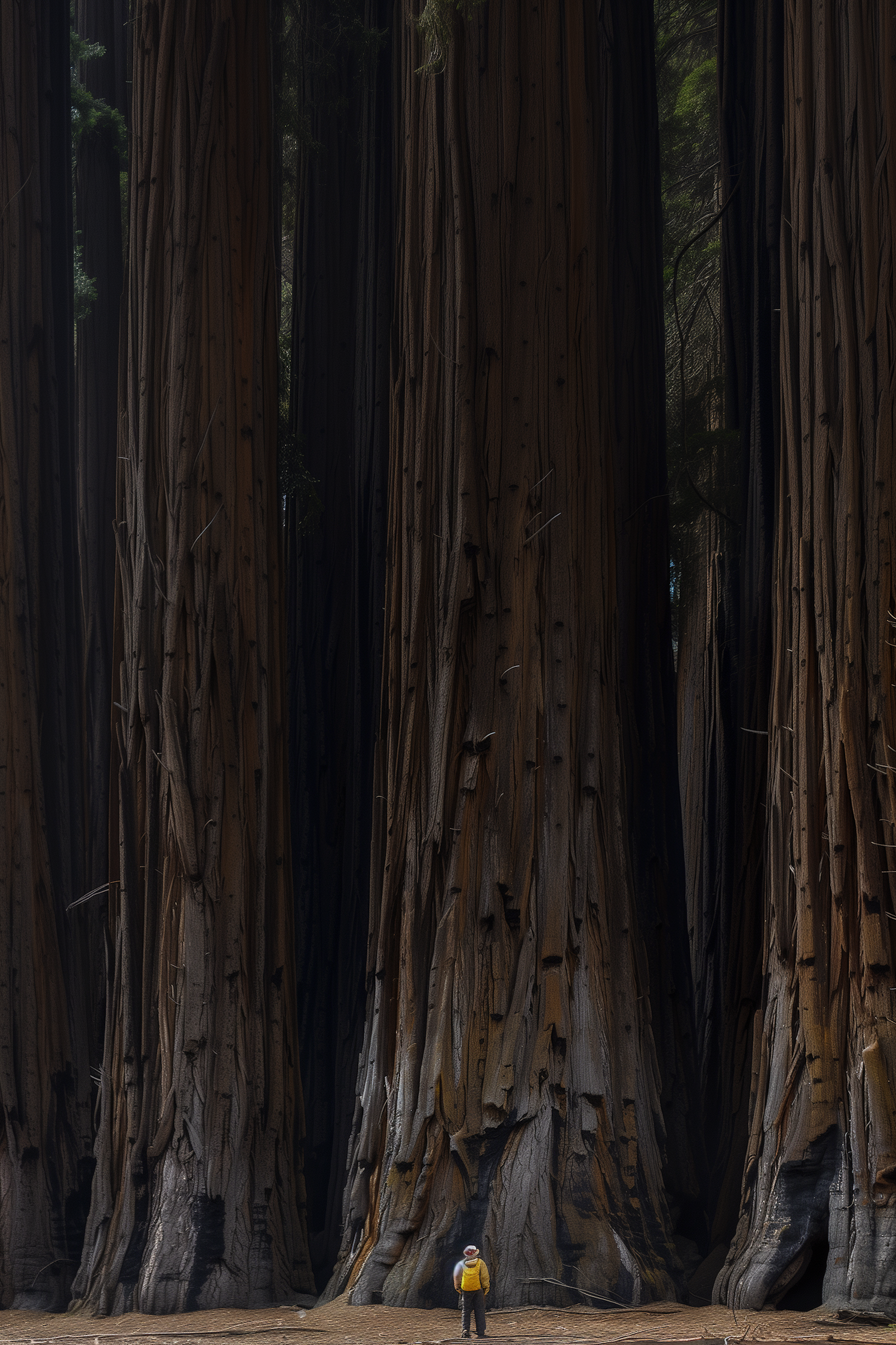 A person in a yellow jacket stands dwarfed by towering, massive trees in a dense forest, highlighting nature's grandeur.