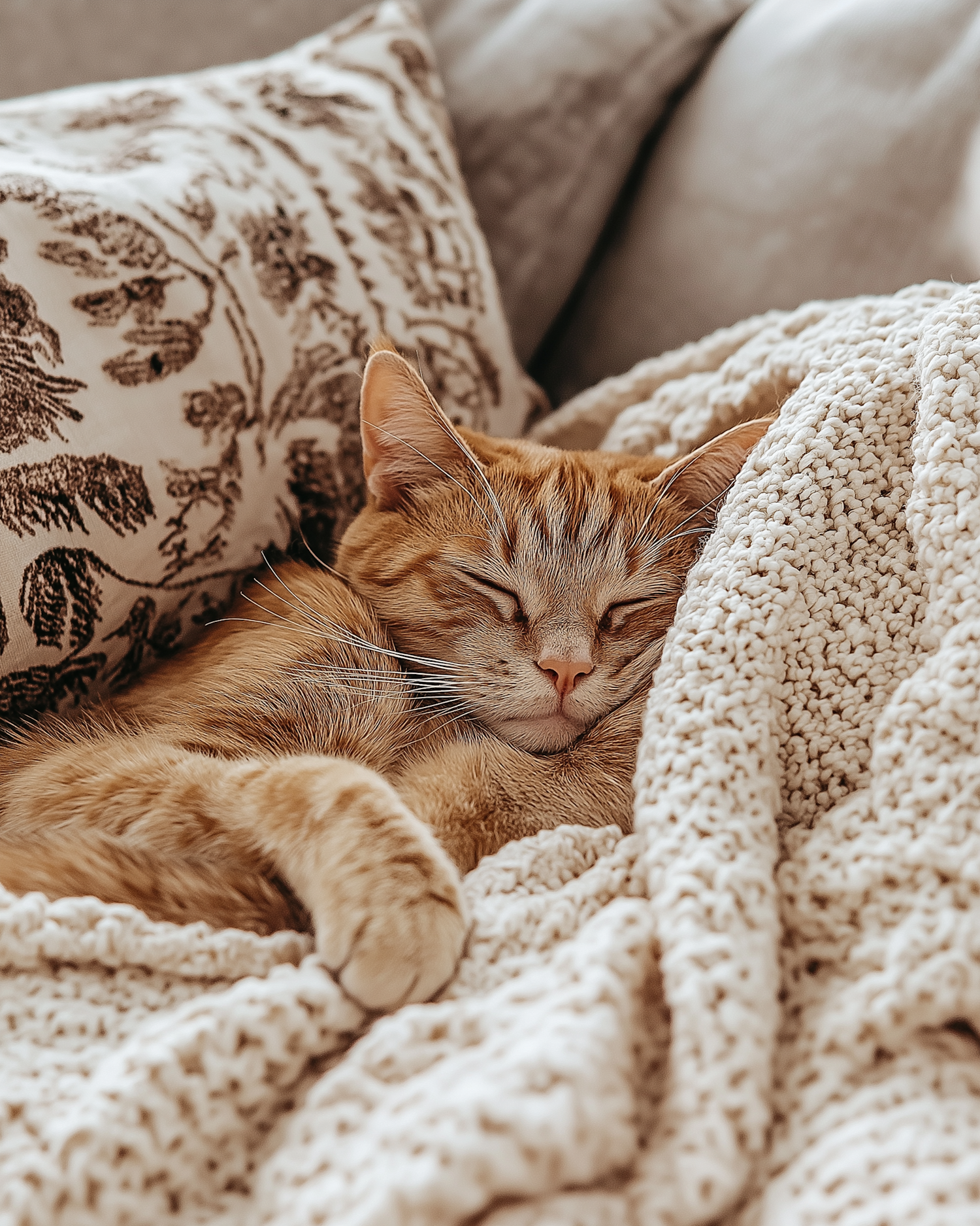 Adorable orange tabby cat sleeping peacefully in a soft knitted blanket with a floral pillow in the background.