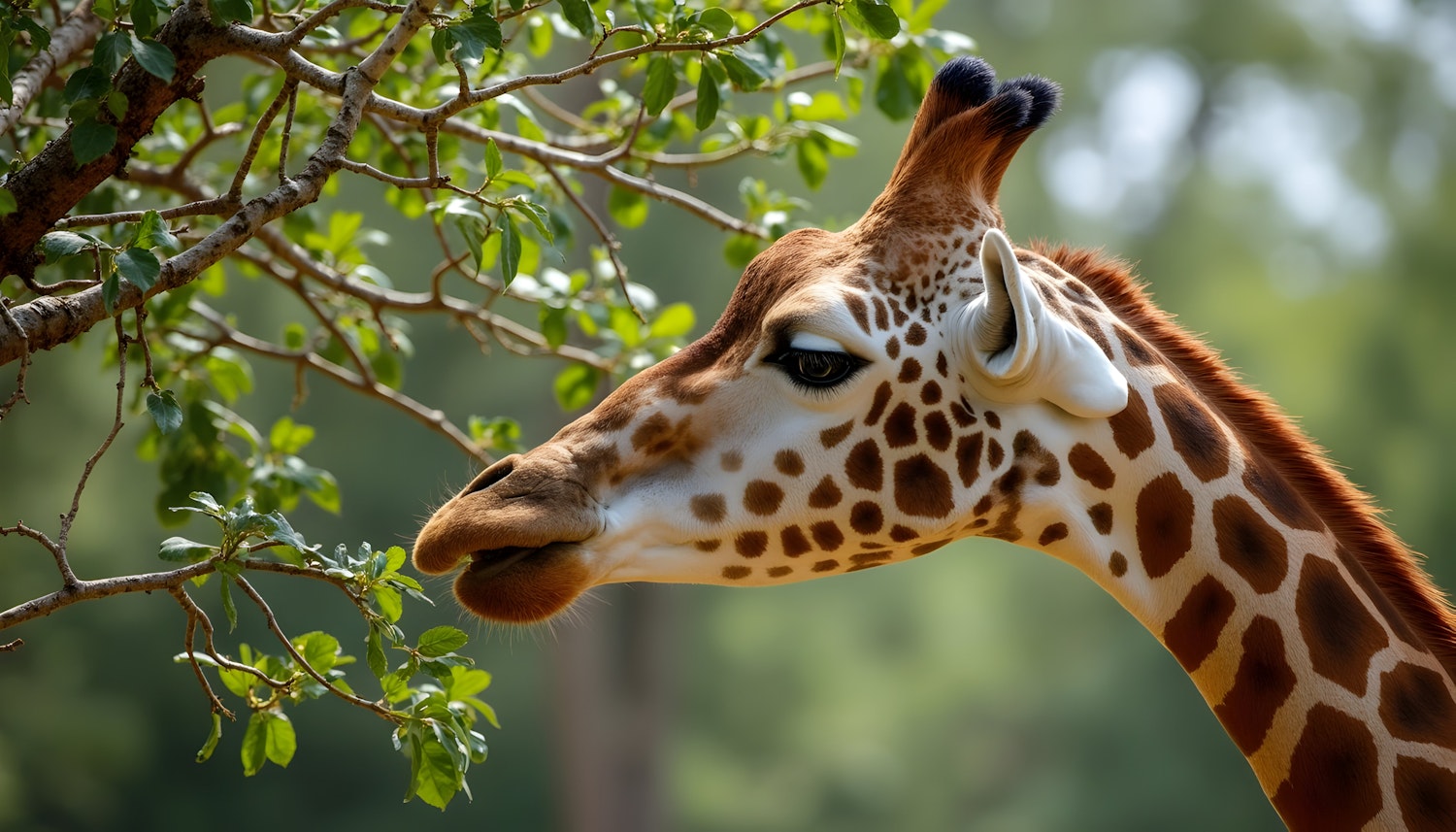 Close-up of a giraffe nibbling on green leaves, showcasing its patterned coat and expressive eyes in a natural setting.