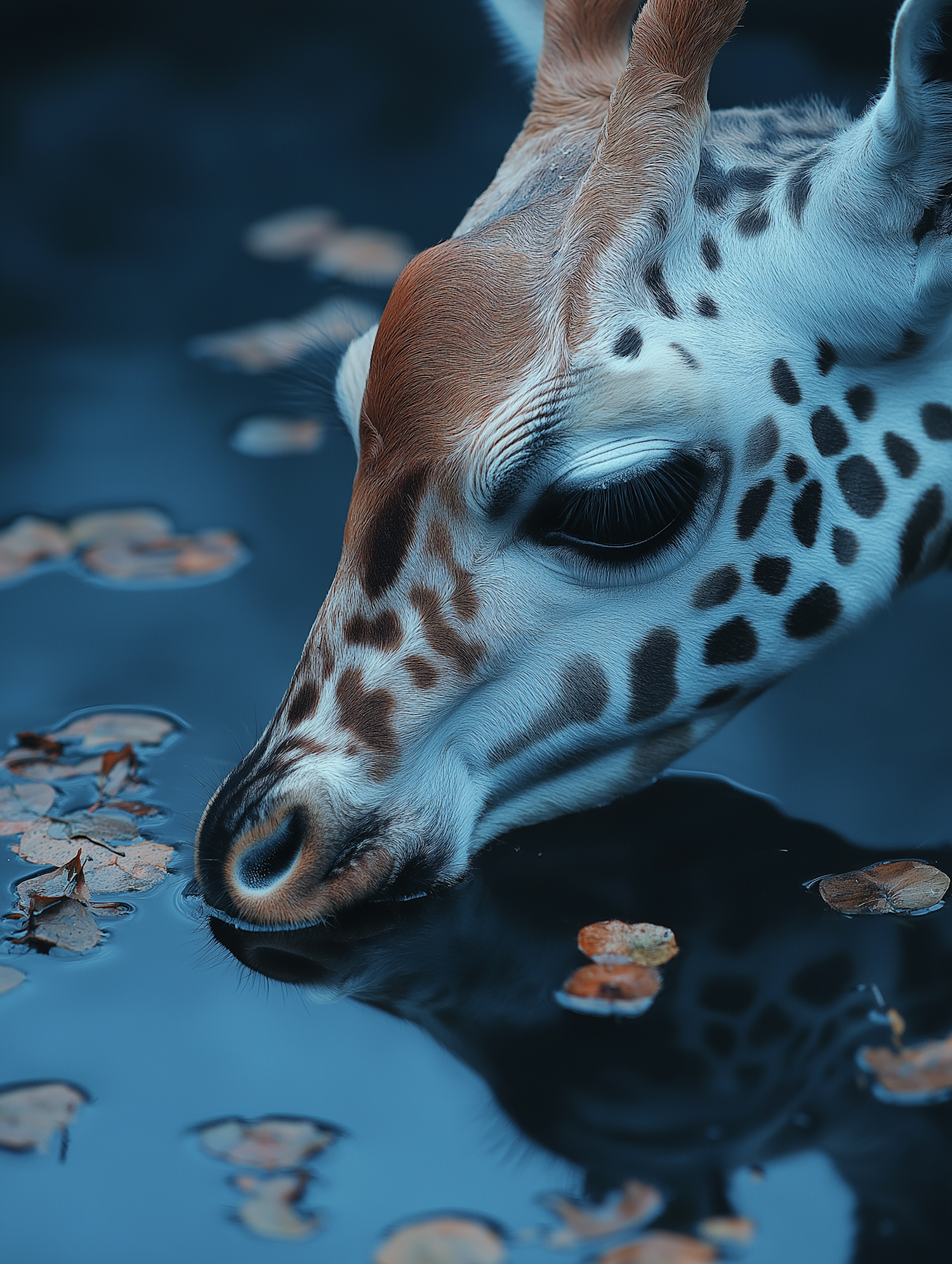 Close-up of a giraffe drinking from a reflective water surface, surrounded by floating leaves, in a serene, blue-toned setting.