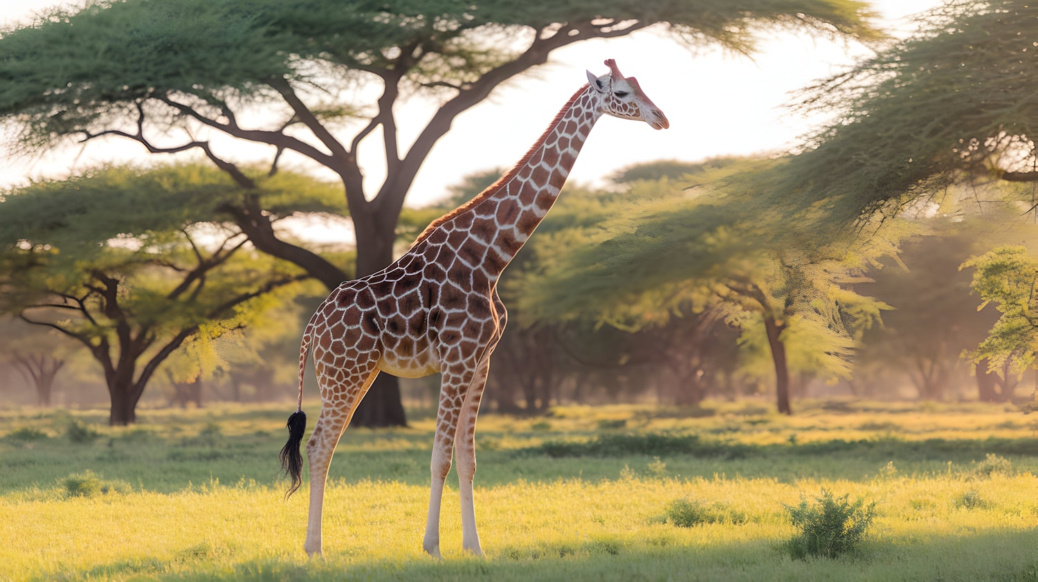 A giraffe stands in a sunlit savanna with lush grass and acacia trees, its patterned coat glowing in the golden light of the serene landscape.