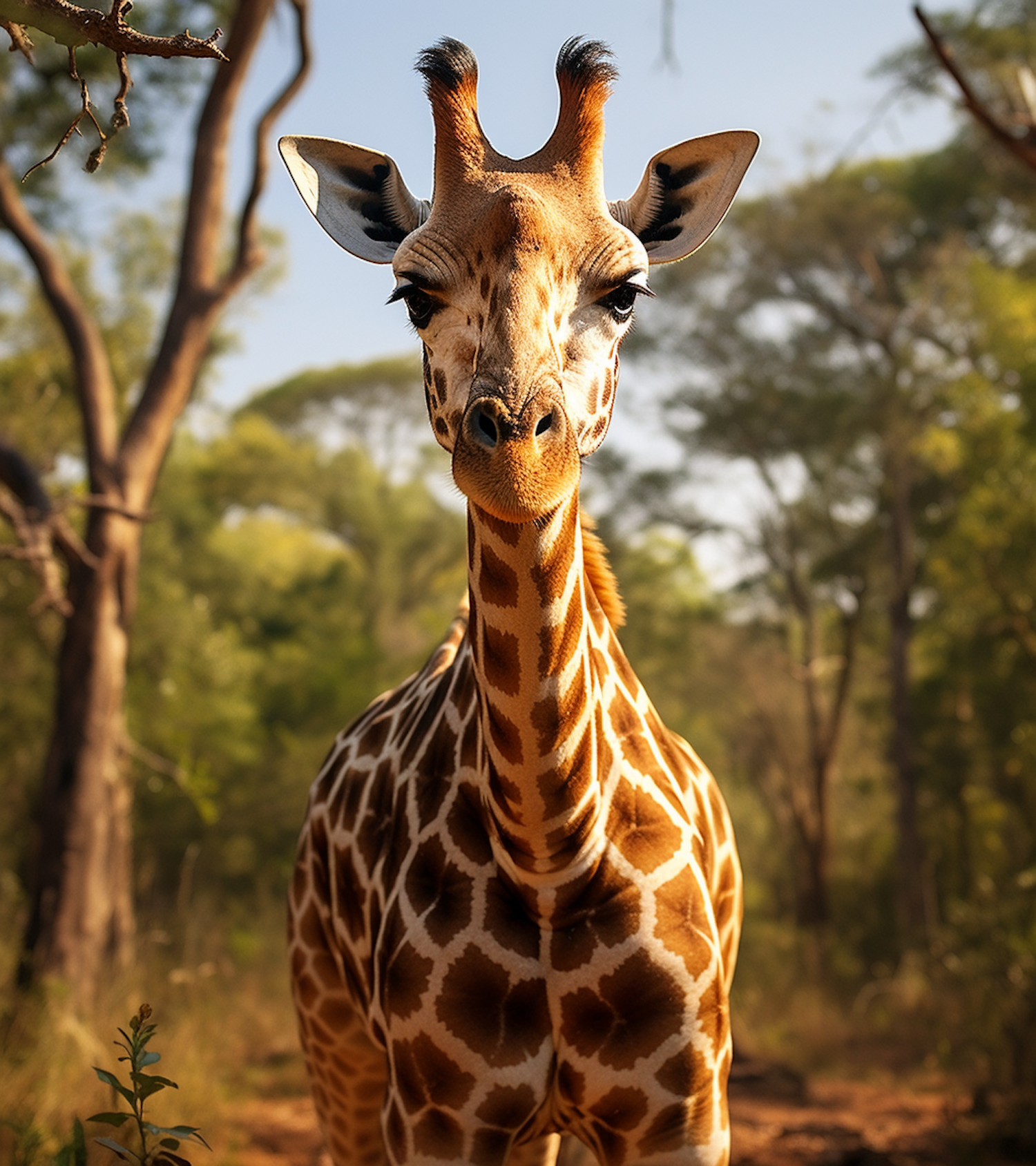 A majestic giraffe stands in a sunlit forest, showcasing its unique patterned coat and gentle expression.