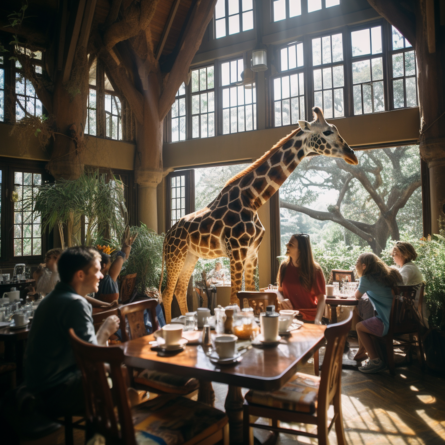 A giraffe mingles with diners in a sunlit room, creating a unique blend of nature and dining experience.