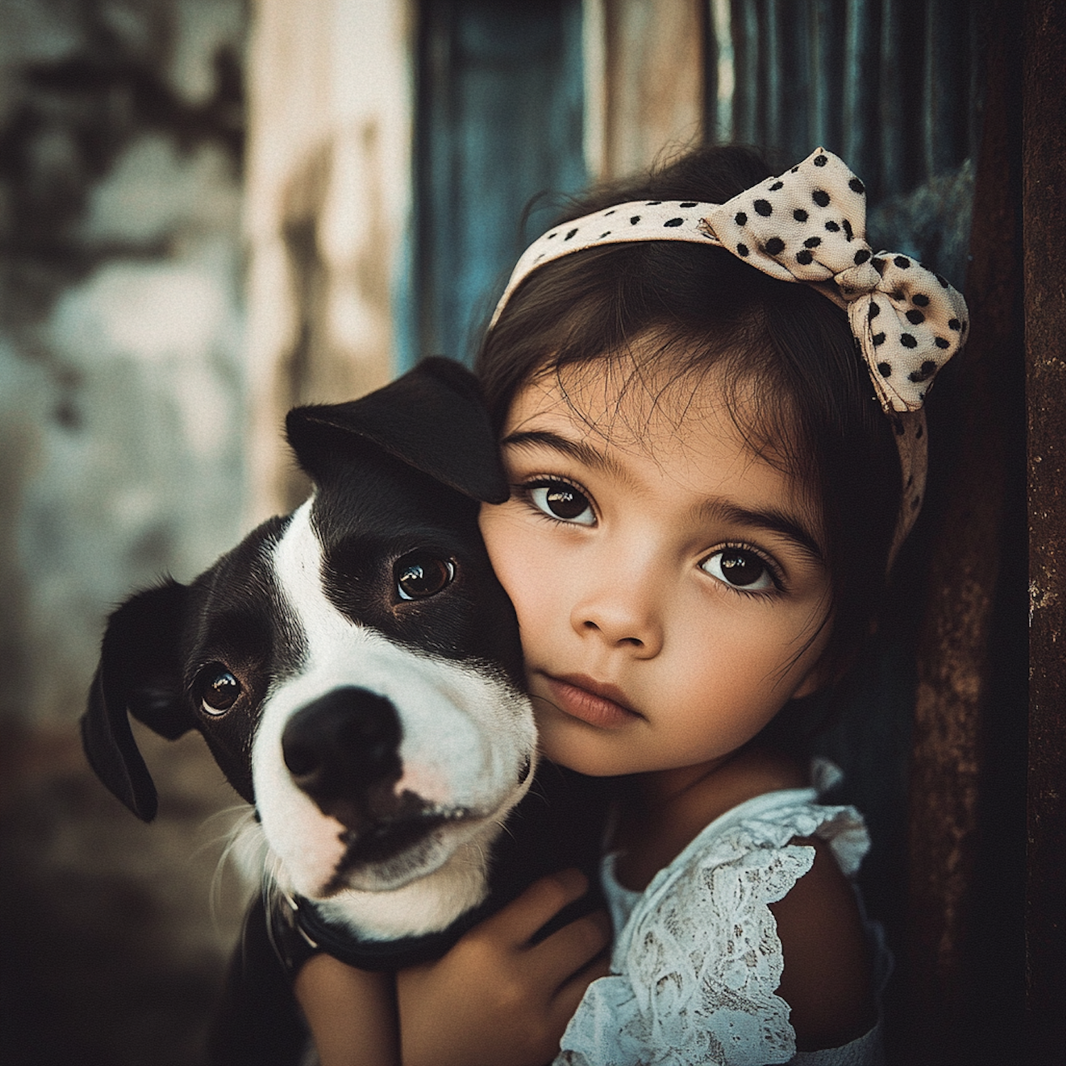 A young girl with a polka-dot headband lovingly embraces her black and white dog, both gazing softly at the camera.
