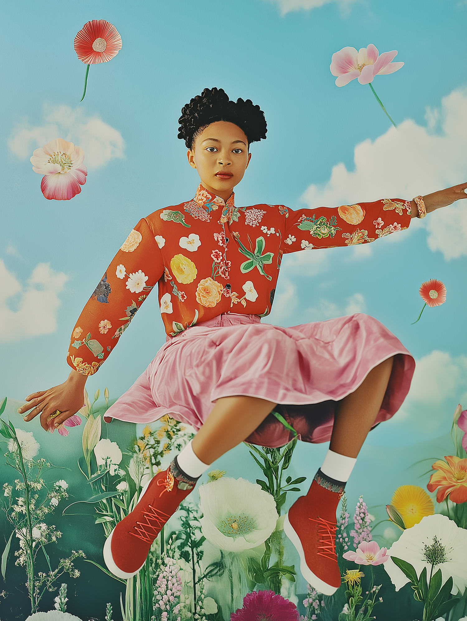 A young woman in a floral blouse and pink skirt jumps against a sky backdrop, surrounded by floating flowers.