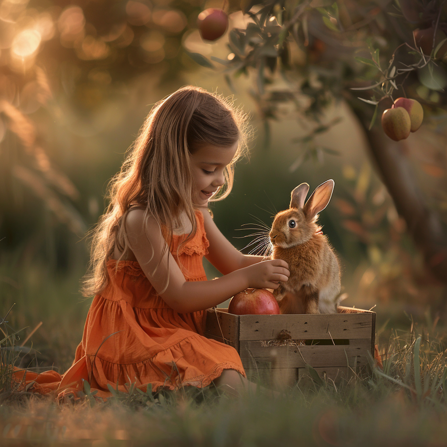 A young girl in an orange dress plays with a rabbit in a sunlit orchard, surrounded by apples and warm golden light.