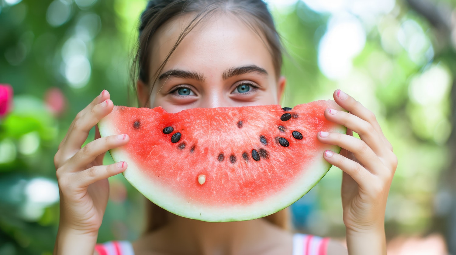 Cheerful young woman holding a vibrant watermelon slice outdoors, mimicking a smile, with lush greenery in the background.