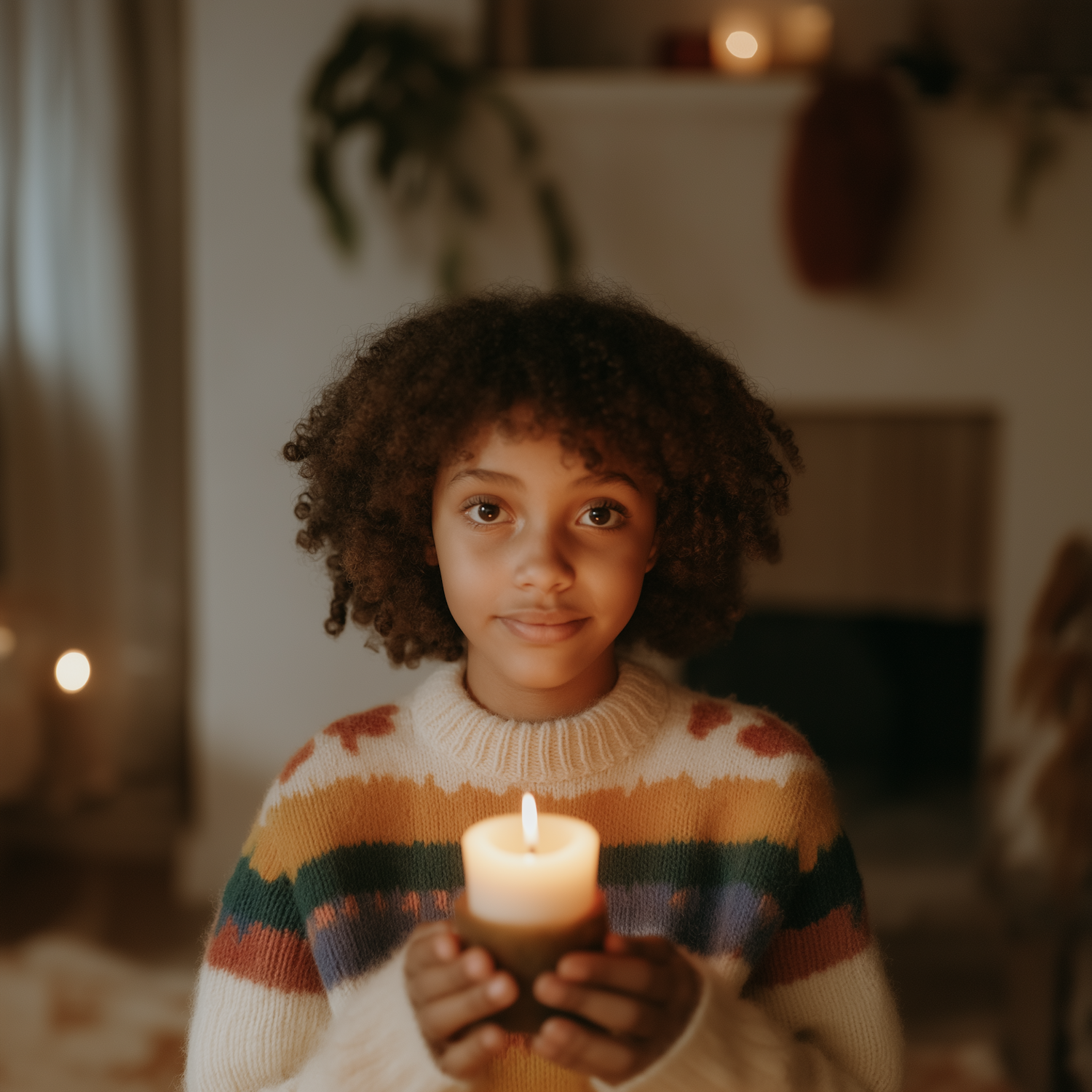 A young girl with curly hair holds a lit candle, wearing a rainbow sweater in a cozy, softly lit room with a blurred fireplace in the background.