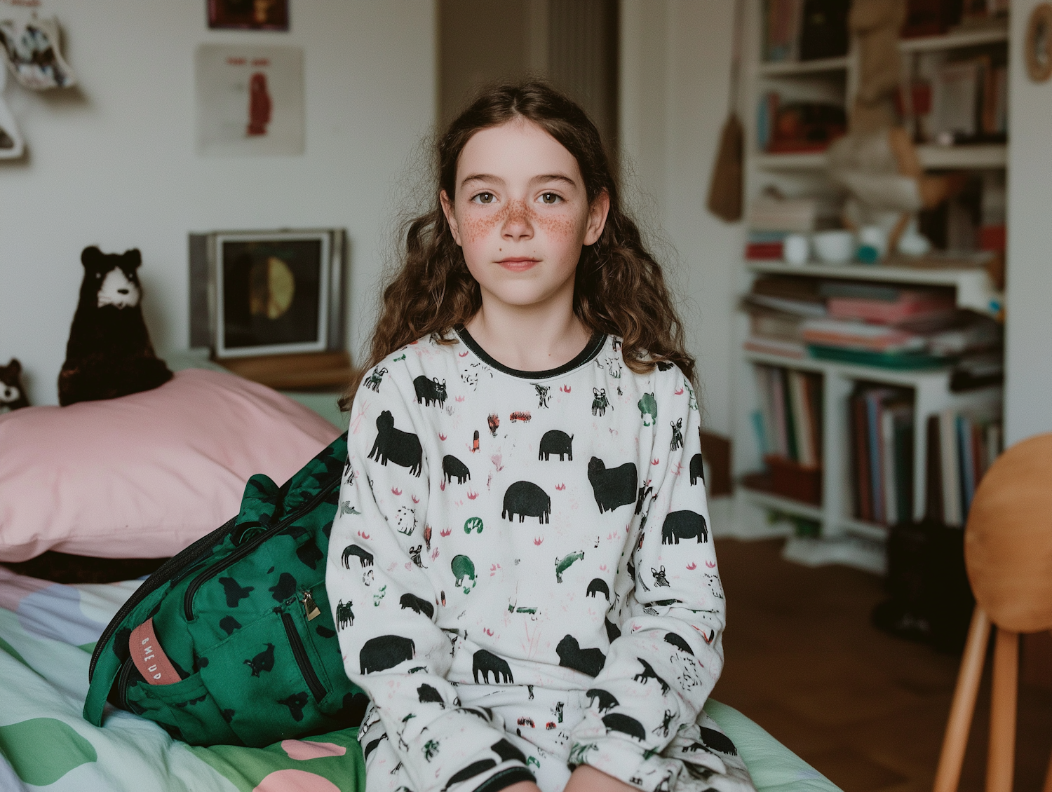 Young girl with curly hair and freckles in animal print pajamas, sitting on a bed with a green backpack in a cozy room.
