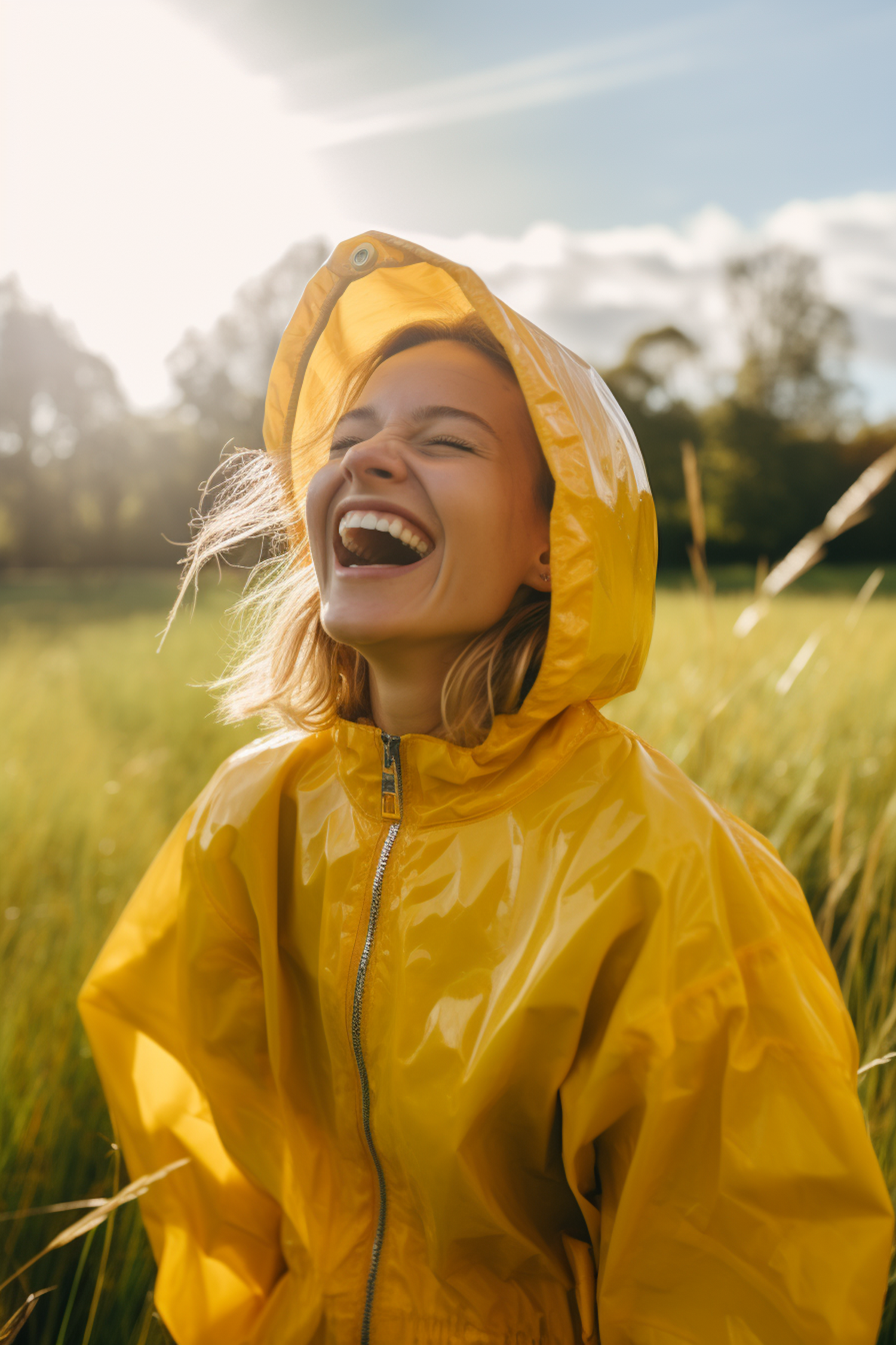 Joyful woman in yellow raincoat laughing in a sunny field, capturing a moment of happiness and freedom.