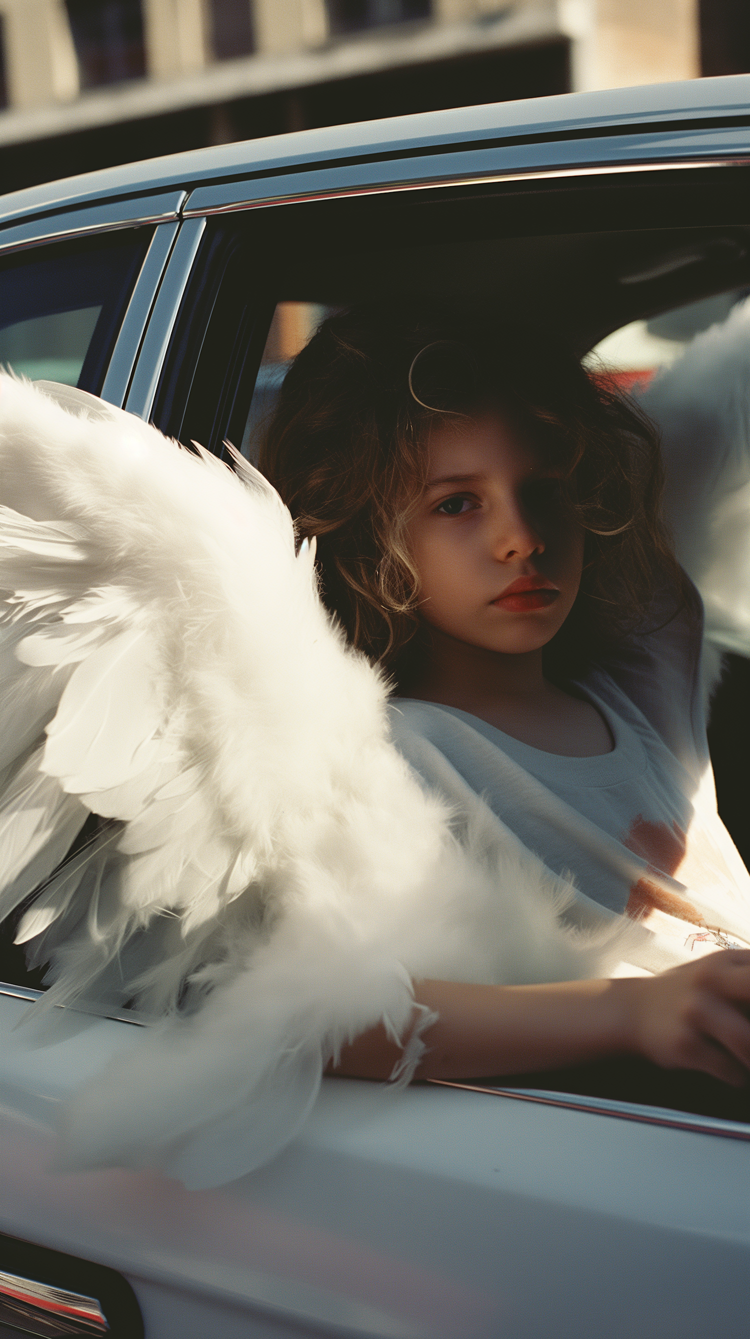 Child with angel wings sits in a car, gazing thoughtfully out the window. Sunlight highlights the fluffy white wings.
