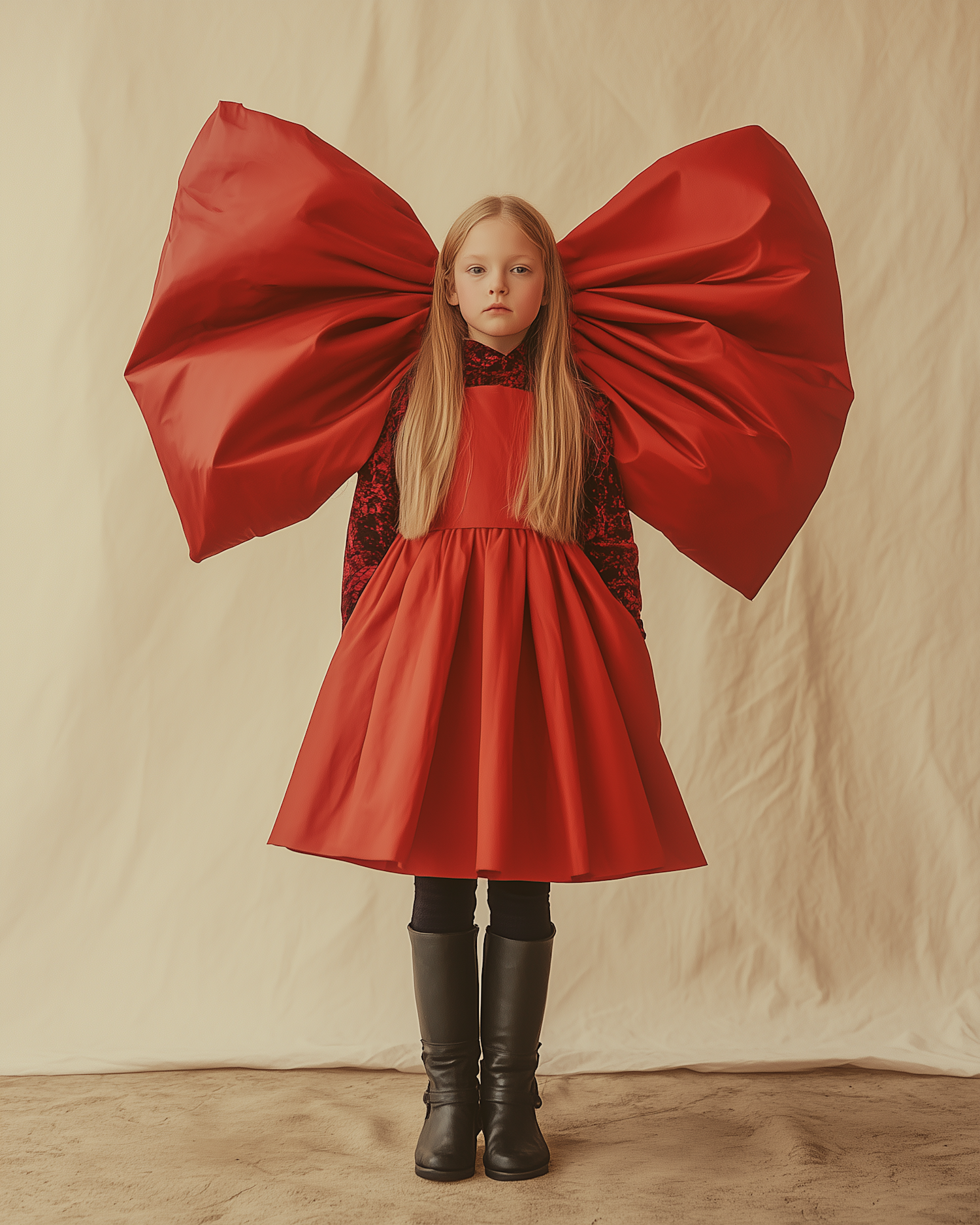 Young girl in a bold red dress with an oversized bow, black tights, and boots, standing against a neutral beige backdrop.