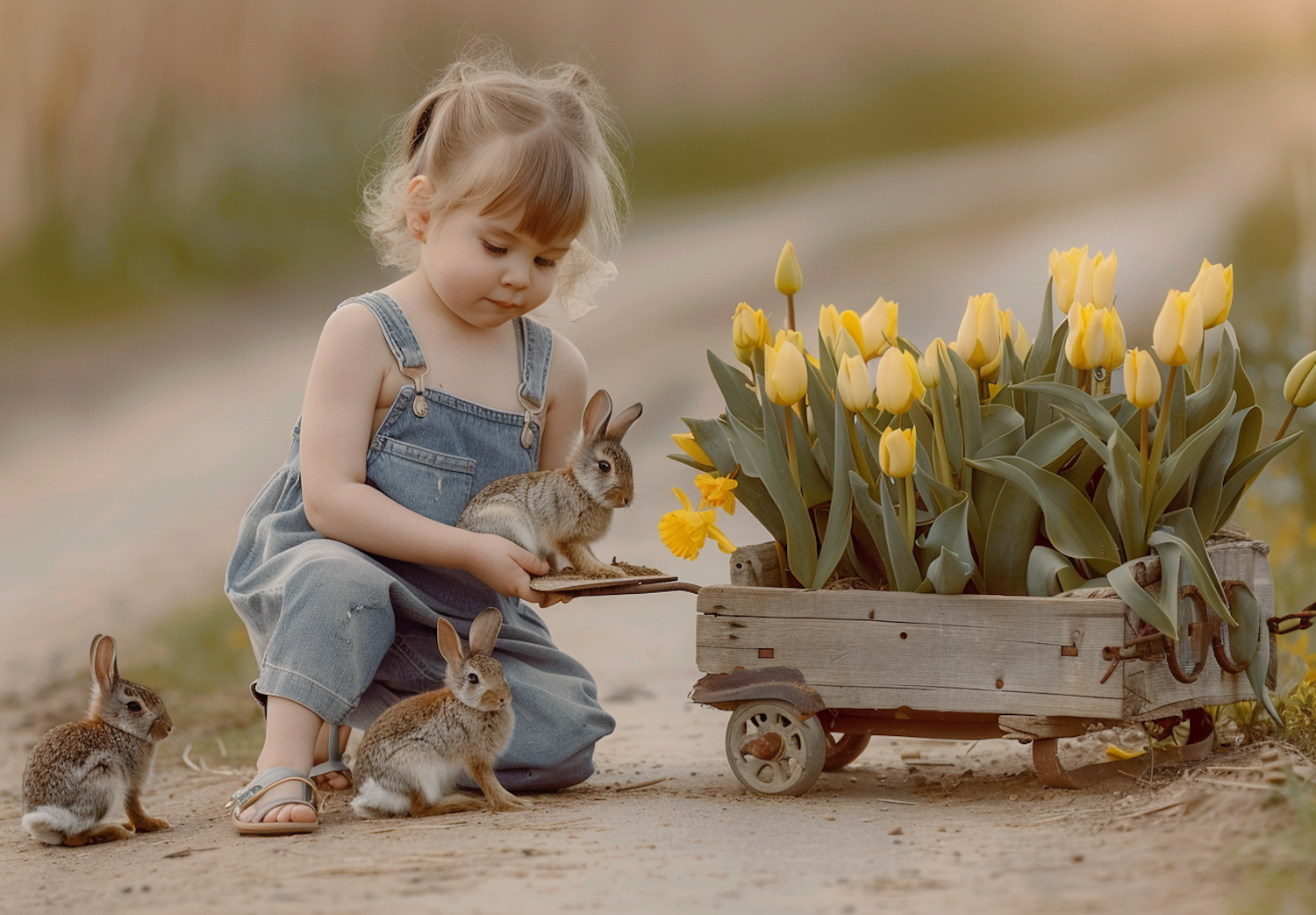 Adorable child in denim overalls with rabbits and a wagon of yellow tulips on a dirt path, evoking a serene countryside vibe.