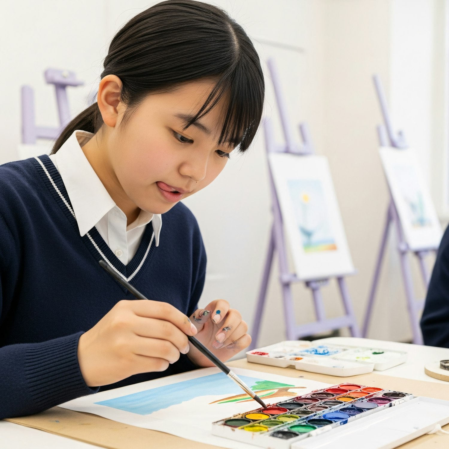 A young girl in a school uniform painting with watercolors in an art class, surrounded by easels and vibrant colors.