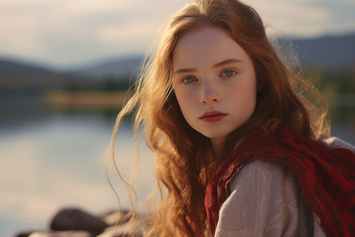 Young girl with red hair and blue eyes by a lake, wearing a red shawl. Serene and contemplative atmosphere.
