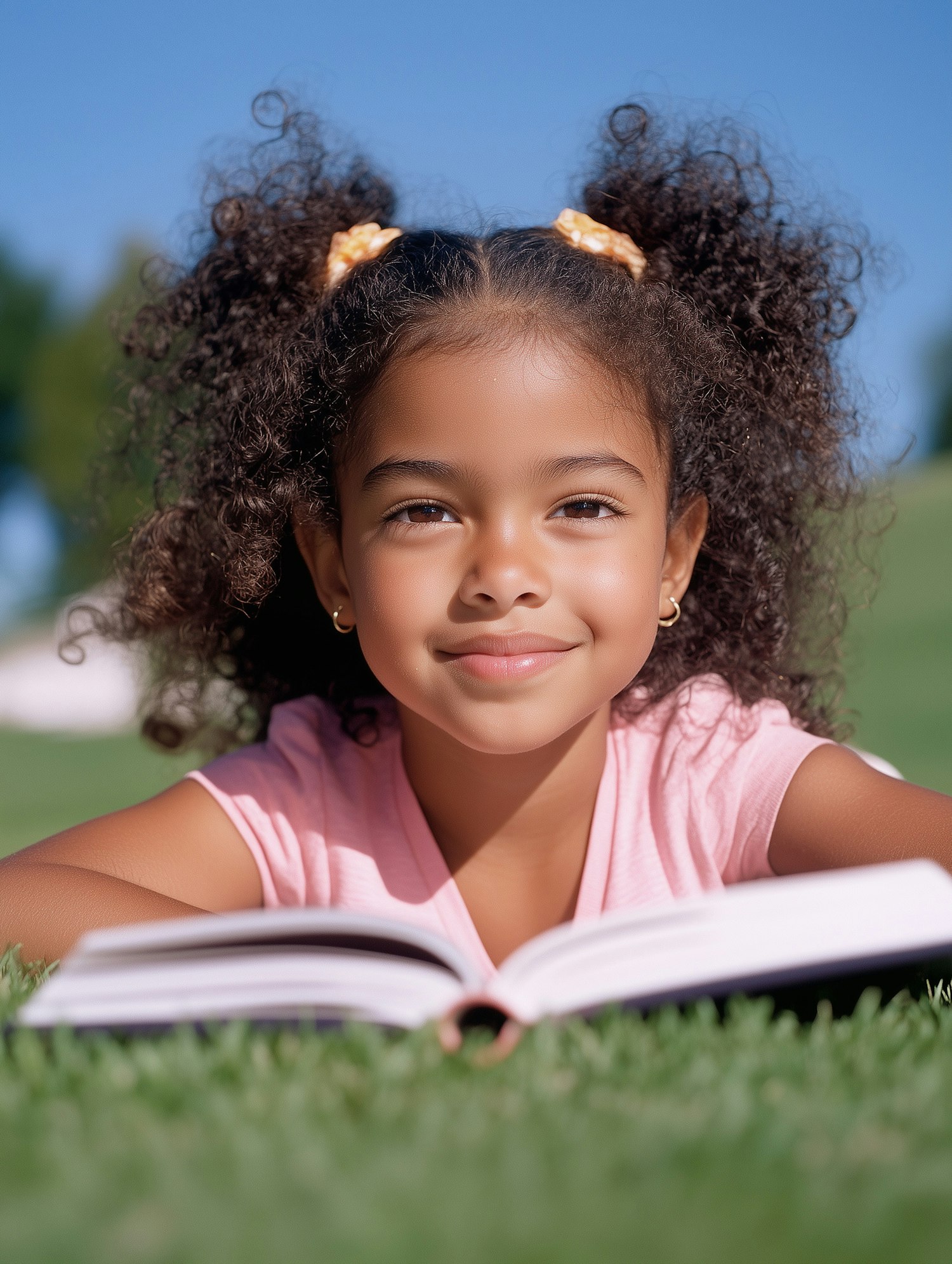 Young girl with curly hair reading a book on the grass, smiling under a clear blue sky. Perfect outdoor reading moment.
