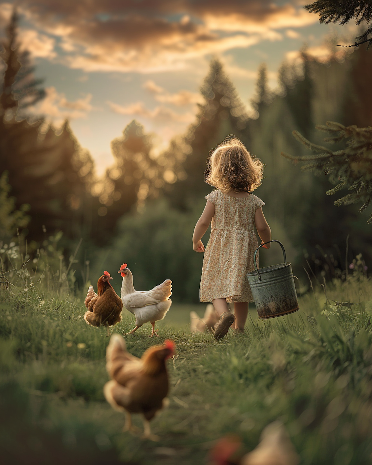 A child with a bucket walks among chickens at sunset, surrounded by trees and a warm, glowing sky.