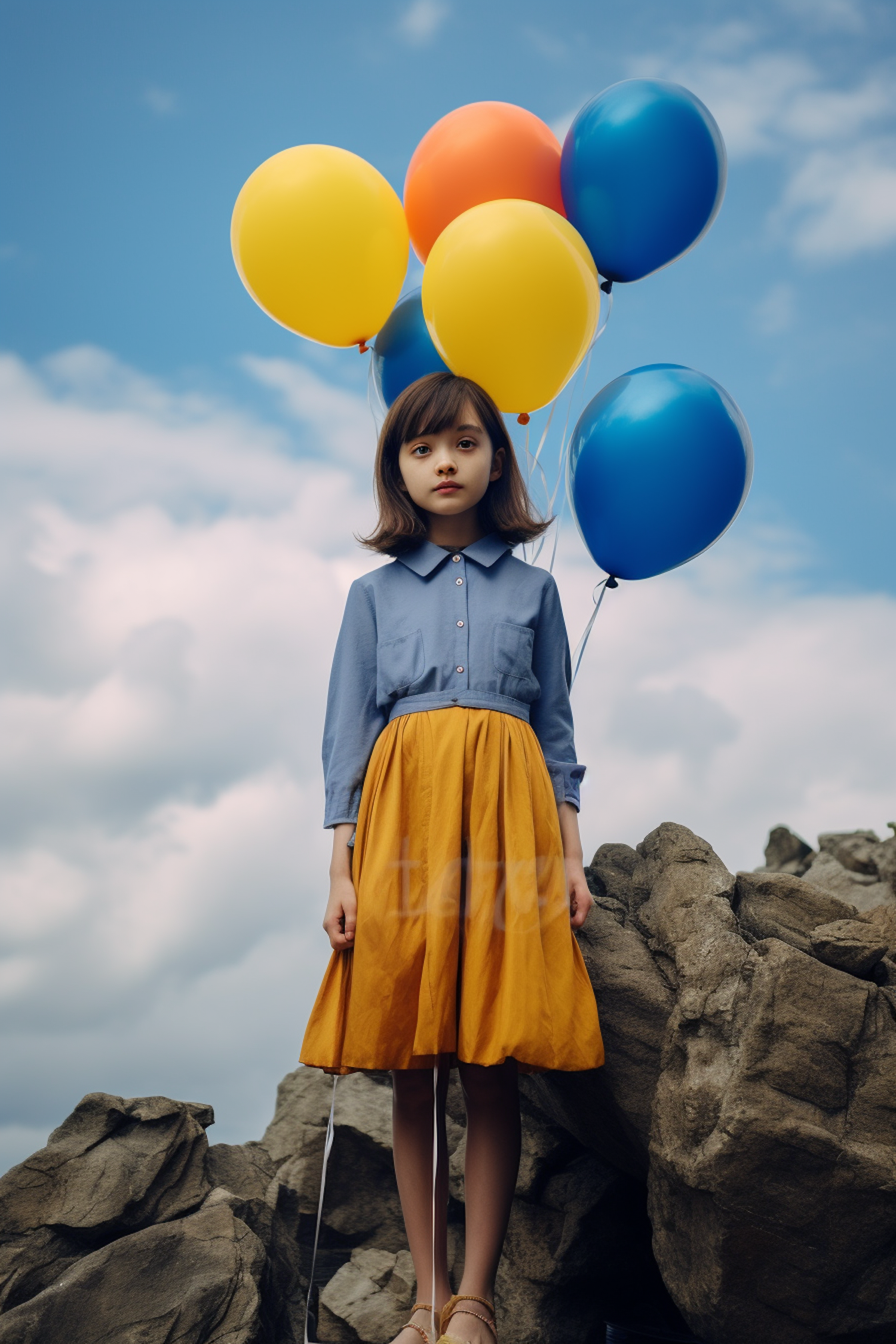Young girl with balloons on rocky terrain, wearing blue and yellow, under a partly cloudy sky.