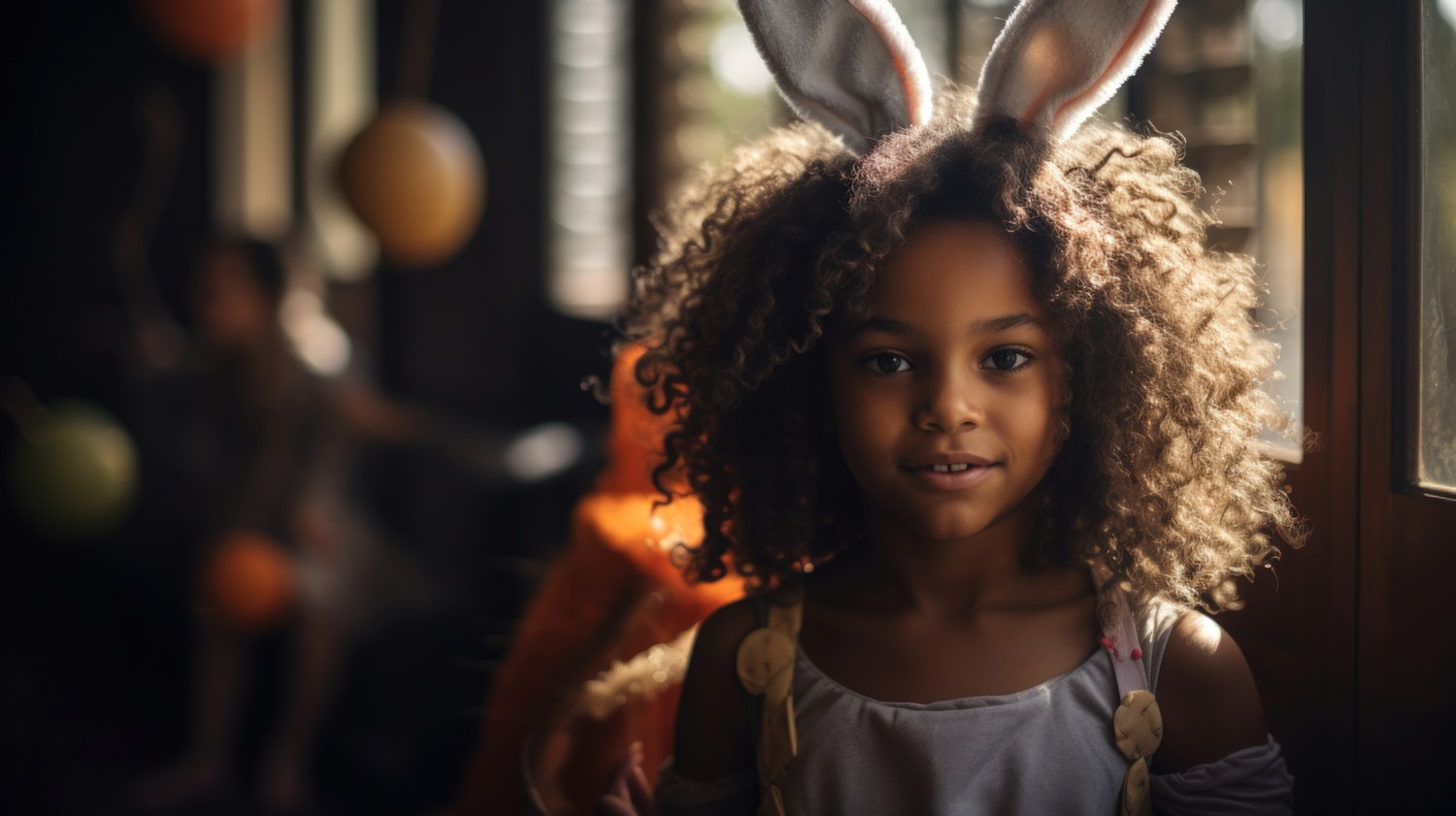 Young girl with curly hair and bunny ears in soft light, festive balloons in background, creating a warm and playful atmosphere.