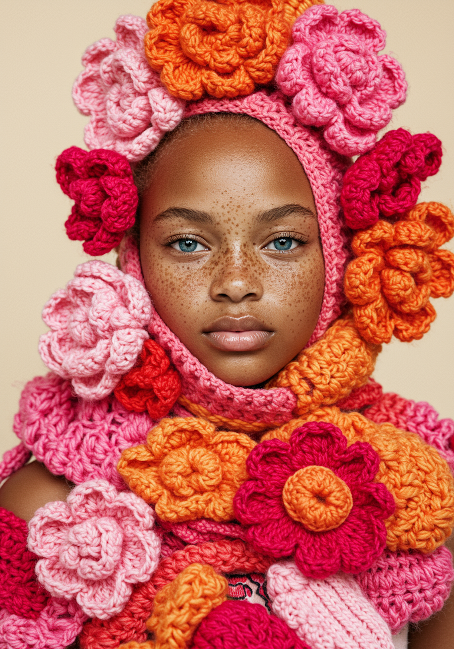 A young girl with freckles and blue eyes wears vibrant crocheted flowers in pink, orange, and red, set against a neutral beige background.