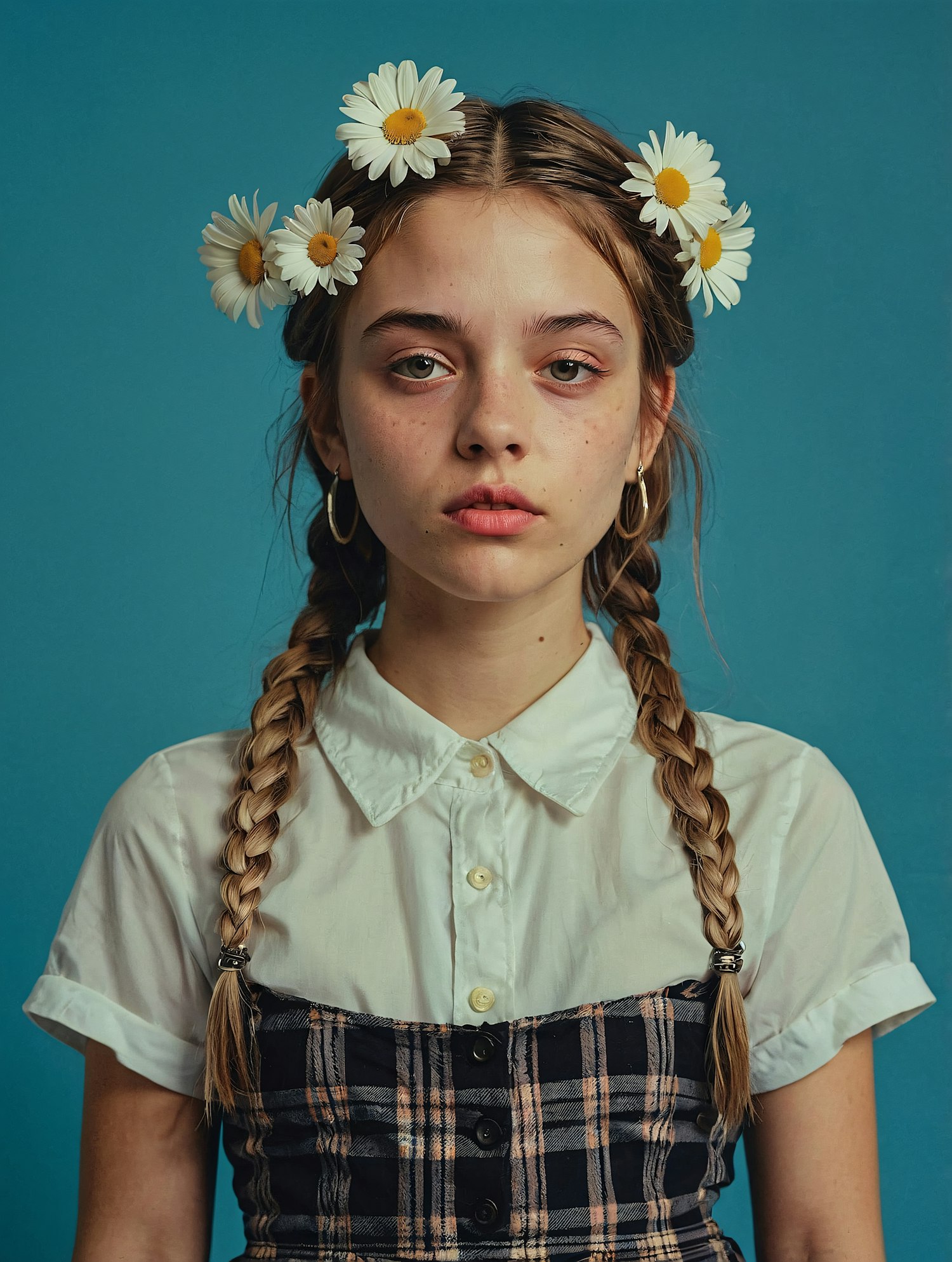 Young girl with braided hair and daisies, wearing a plaid dress and white shirt against a teal background.