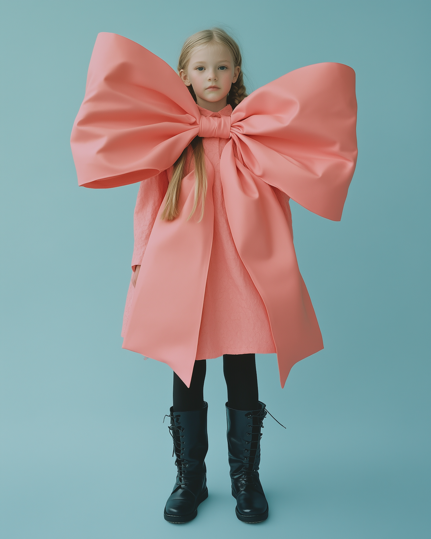 Young girl in a pink dress with a giant bow, black tights, and boots against a teal background. Fashion-forward and striking.
