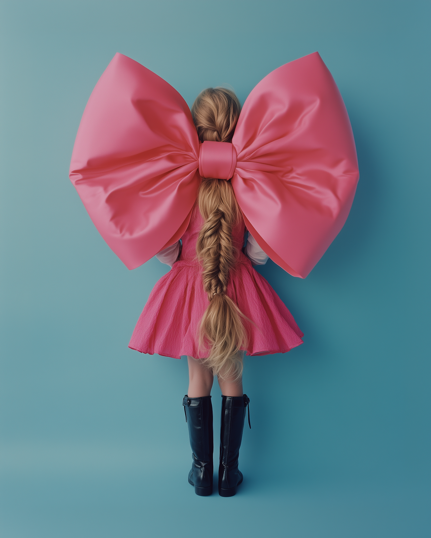 Young girl with a giant pink bow and matching dress, standing against a light blue background. Whimsical and colorful fashion statement.